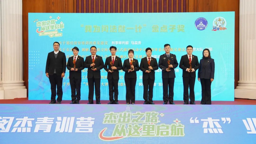 团区委书记、青联主席郑晓珺,市高院直属机关团委书记刘志超为营员颁发“我为闵法献一计”金点子奖荣誉证书