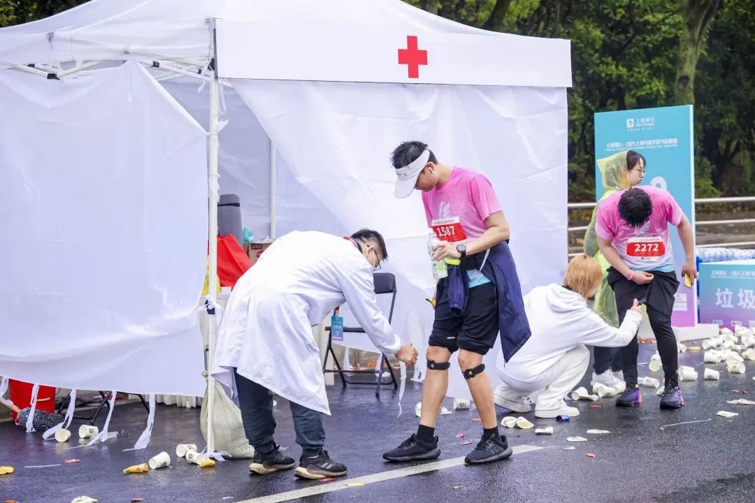 现场,补给站为跑者提供充足的能量和饮料补给,助力选手快速恢复体力。医疗团队时刻待命,为选手喷上专用药剂,缓解膝盖的酸痛,让选手能安心向终点进发。