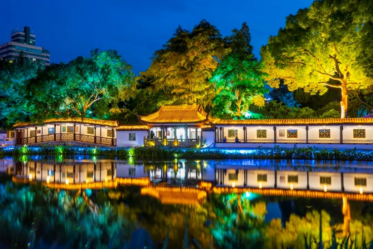 夜幕降临,华灯初上,曲水园内,荷花池、睡莲池等,在霓虹灯的照射下,格外雅致。景观照明亮起,园外环城河的美被诠释得淋漓尽致,古典园林与绚丽光影相互叠加,光与影交织,营造出一种梦幻般的氛围。
