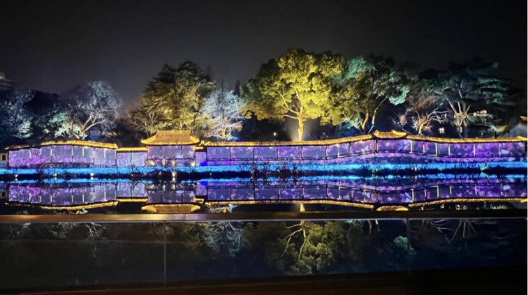 曲水园是上海五大古典园林之一,始建于公元前1745年,以小巧玲珑、典雅古朴著称,具有较高的江南园林建筑艺术价值。在本次光影节中,曲水园生态廊道延伸灯光景观带将现代建园构思与传统江南园林风格融为一体,呈现独具青浦特色、凸显江南文化底蕴的滨水景观。通过《四时》投影秀春、夏、秋、冬四个篇章,以青浦特有的花卉和季节为串联,展现青浦的诗情画意和历史传承,绘制成一幅绚丽光影画卷。