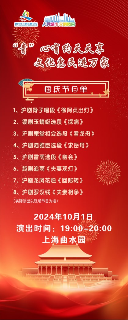 发挥曲水园作为新时代文明实践公园在凝聚群众、引导群众的重要阵地作用,在国庆节推出优质文明实践活动,将沪剧、越剧等传统戏曲送到群众身边,弘扬优秀传统文化,树立文明新风,增进群众对“幸福温暖家”的热爱。