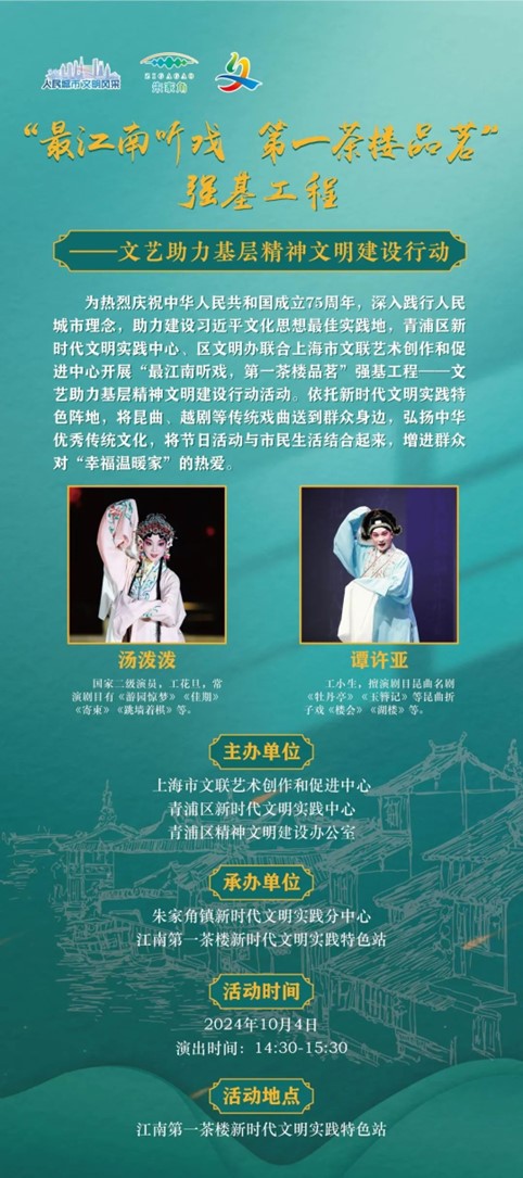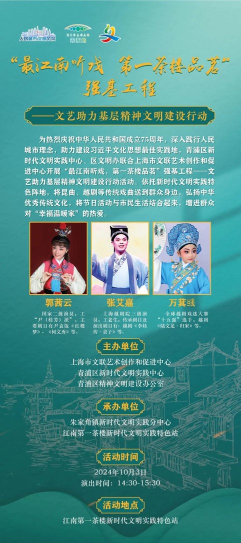 联合上海市文联艺术创作和促进中心开展“最江南听戏,第一茶楼品茗”强基工程——文艺助力基层精神文明建设行动活动。积极发挥江南第一茶楼作为新时代文明实践特色站在凝聚群众、引导群众的重要作用,在重点节日推出优质文明实践活动,将昆曲、越剧等传统戏曲送到群众身边,弘扬中华优秀传统文化,将节日活动与市民生活结合起来,增进群众对“幸福温暖家”的热爱。