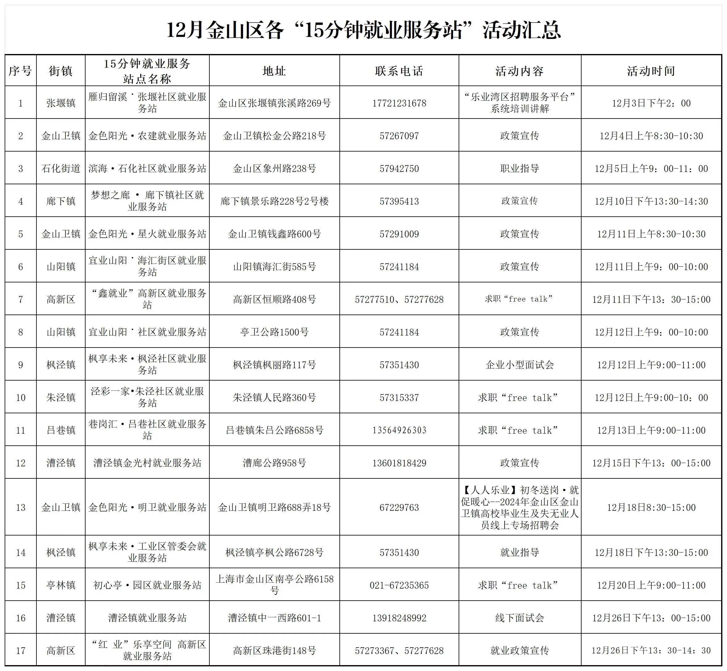 金山区“15分钟就业服务站”活动预告