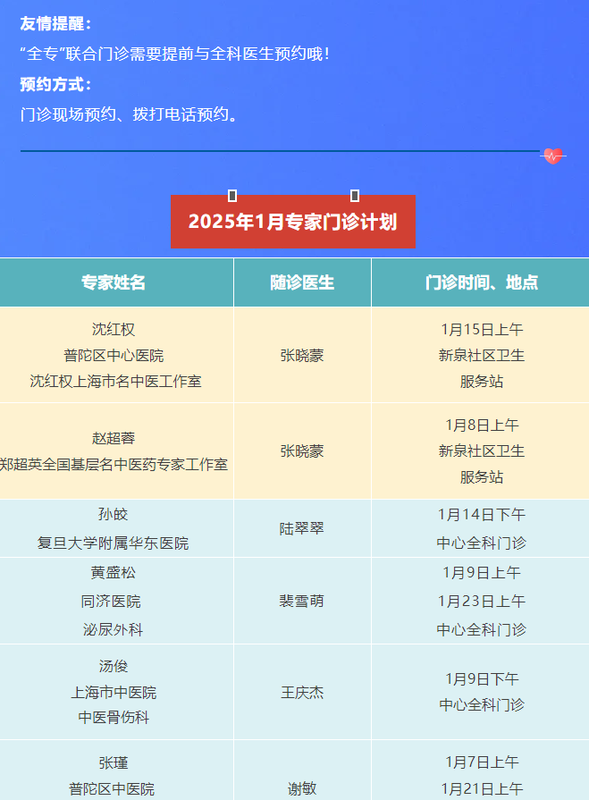 “家门口”就能看名医!普陀2025年1月专家门诊安排来啦 2025-01-02 来源:普陀区人民政府