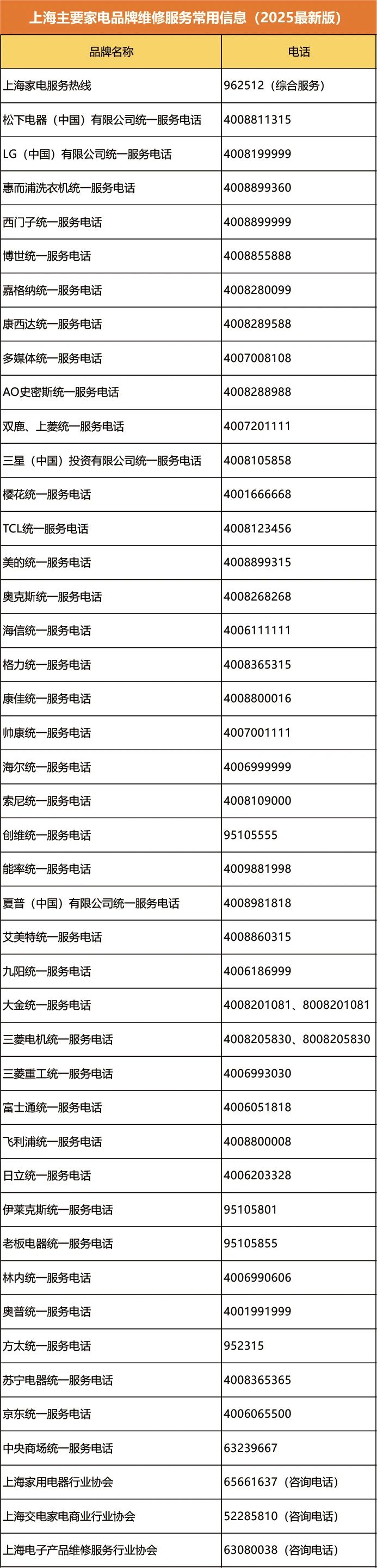 上海主要家电品牌维修服务常用信息(2025最新版)