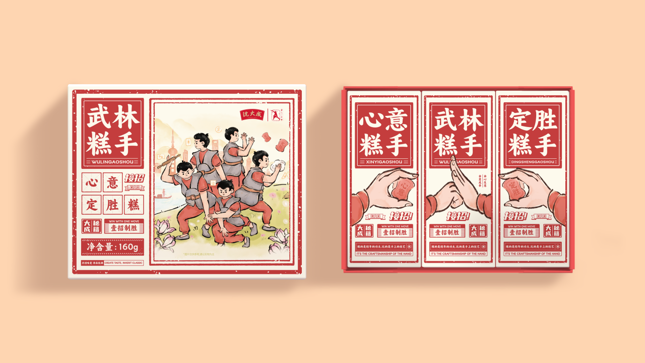 “‘武林糕手’心意定胜糕”为国家级非遗项目卢氏心意拳携手沈大成点心制作技艺的联名共创作品,荣获第三届国潮文创设计大赛最佳设计奖。