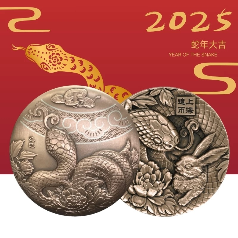 蛇年上新“灵蛇献瑞”手雕大铜章为上海造币有限公司铸造,材质为紫铜、银,主图案“蛇盘兔”和“吐祥瑞”形象采用高浮雕工艺,寓意家宅兴旺,万事顺逐;如意纹则采用金银错工艺,寓意如意长伴,步步生辉。来上海造币有限公司,将新春福利带回家!