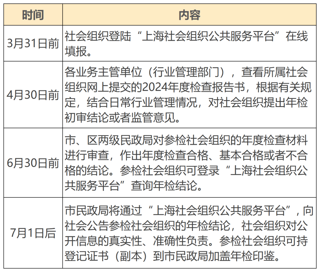 根据《中华人民共和国慈善法》《社会团体登记管理条例》《基金会管理条例》《民办非企业单位登记管理暂行条例》等有关规定,本市于2025年3月1日至6月30日实施2024年度社会组织年度检查和年度报告(以下简称年检)。今年的网上填报时间是2025年3月1日至31日!普陀社会组织快及时进行年检年报相关工作哦~