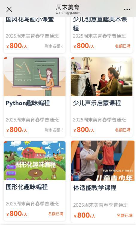 3月11日上午10时,2025年普陀区周末美育课堂春季班招生正式拉开帷幕,短短几分钟内,甘泉社区文化活动中心的图形化趣味编程课及少儿声乐启蒙课、宜川社区文化活动中心的体适能教学课便被一抢而空,课程受欢迎程度在各区分校中名列前茅。图形化趣味编程课虽然已开设多次,依然深受小学员喜爱,继续成为普陀区最快被抢完的课程。此外,少儿创意童趣美术课、Python趣味编程课也已陆续满额,硬笔基础课等仅剩少量名额。