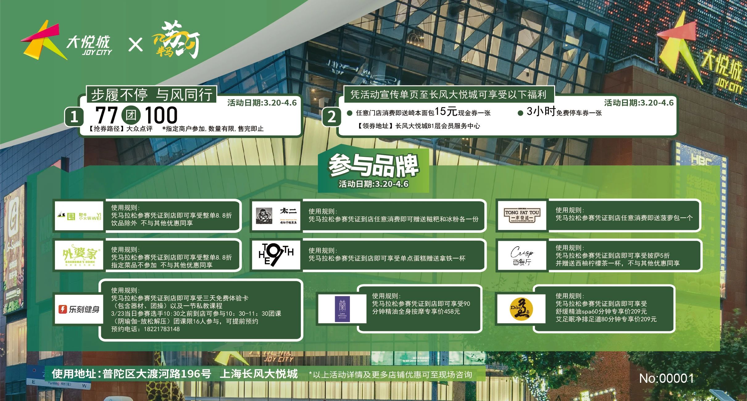 环球港、大洋晶典天安千树、长风大悦城和百联中环普陀区四大地标商场联袂出击,合计为跑者们奉上了超100项专属优惠活动。