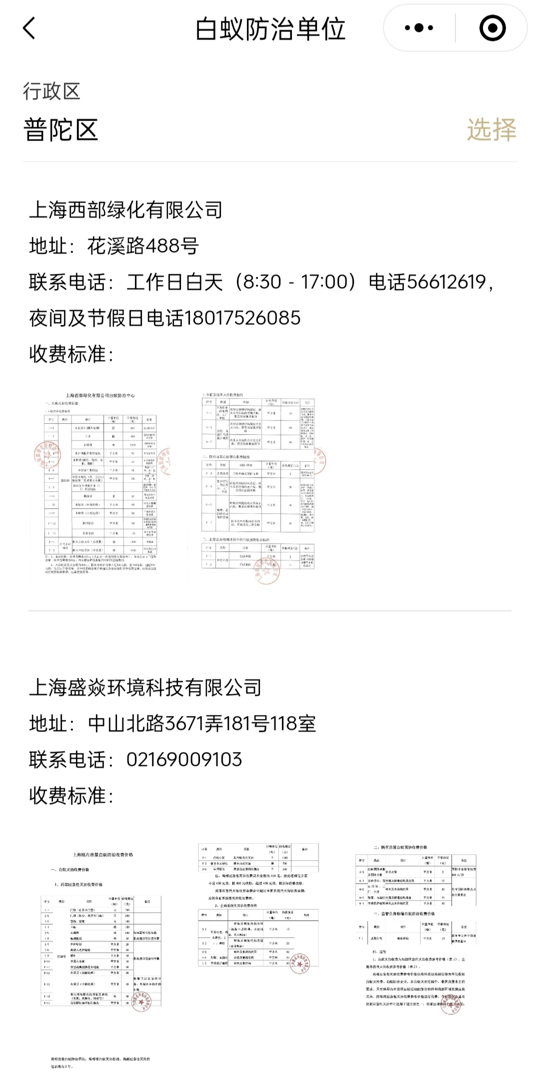 注册“上海物业”小程序,绑定小区后,可在“上海物业”小程序“寻找服务”菜单中的“白蚁防治企业”名录中查询白蚁防治企业的联系电话、收费标准等。