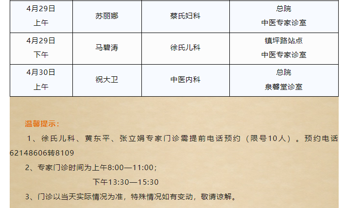 1、门诊以当天实际情况为准,特殊情况如有变动,敬请谅解。