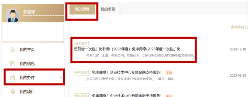 1.短消息提醒:经大数据比对初步符合补助条件的社保缴费地为普陀的企业,“一网通办”平台通过站内信精准推送企业补助意愿确认及企业信息更新的通知。