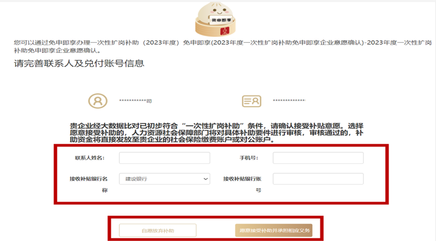 3.“一网通办”平台企业确认页面需填写以下信息:联系人姓名、手机号、接收补助银行名称、接收补助银行账号。企业选择“愿意接受补助并承担相应义务”时相关信息为必填项。