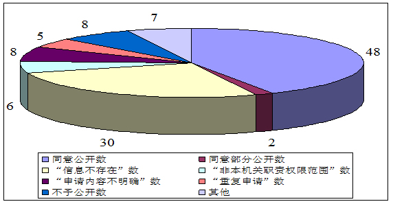 其他情况64件。其中,“信息不存在”30件,占其他情况总数的46.9%;“非本机关职责权限范围”6件,占其他情况总数的9.4%;“申请内容不明确”8件,占其他情况总数的12.5%;“重复申请”5件,占其他情况总数的7.8%;“不予公开”8件,主要涉及商业秘密,占其他情况总数的12.5%;“申请人主动撤销”7件,占其他情况总数的10.9%