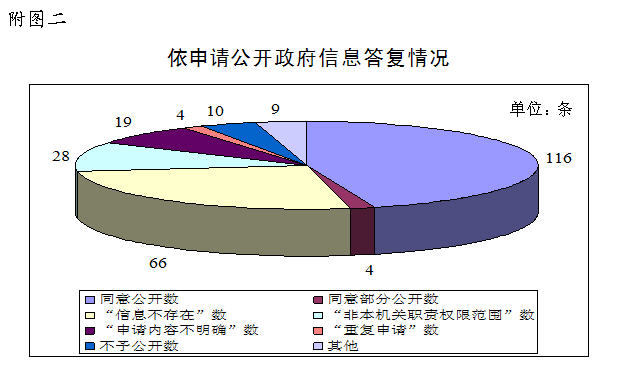 在市局已经答复的222件申请中,“同意公开”的109件,占已经答复总数的49%。其他情况113件。其中,“信息不存在”53件,占已经答复总数的23.8%;“非本机关职责权限范围”28件,占已经答复总数的12.6%;“申请内容不明确”18件,占已经答复总数的8.1%;“重复申请”4件,占已经答复总数的1.8%;“不予公开”1件,主要涉及商业秘密,占已经答复总数的0.5%;“申请人主动撤销”8件,占已经答复总数的3.6%,“非信息公开申请”1件,占已经答复总数的0.5%。
