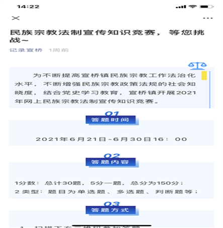 为了增强活动效果,各街镇针对不同的社会群体,采取了线上线下相结合和市民群众喜闻乐见的方式进行宣传教育引导,收到很好的效果。比如合庆镇利用居民疫苗接种留观区开展民族宗教趣味有奖问答,塘桥街道、宣桥镇等街镇通过微信公众号开展线上“民族宗教知识竞赛”。