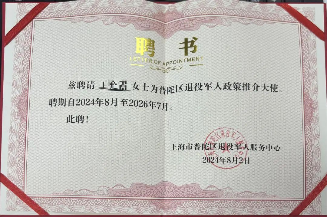 活动最后,区退役军人事务局副局长姚红权为程玉松等七名代表颁发“普陀区退役军人政策推介大使”聘任书。希望他们成为我区退役军人政策宣传的重要力量,为退役军人及社会各界架起沟通的重要桥梁,也为退役军人的就业发展作出重要贡献。