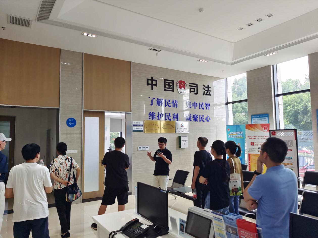 两名来自华东政法大学的实习生化身“讲解员”,带领大家依次参观了公共法律服务工作站接待大厅、人民调解工作室、劳动争议仲裁庭等各功能室。公共法律服务工作站以开放的姿态欢迎居民群众按需选择各项公共法律服务。