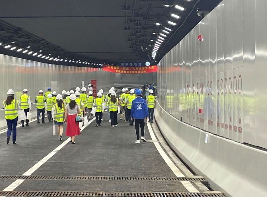7月9日下午3点,杨浦区建管委组织开展淞沪路-三门路下立交通车前人民建议征集暨政府开放日活动,邀请区人大代表、政协委员、部分沿线居民、企业代表参观地道和空中连廊,提前探营,先睹为快。