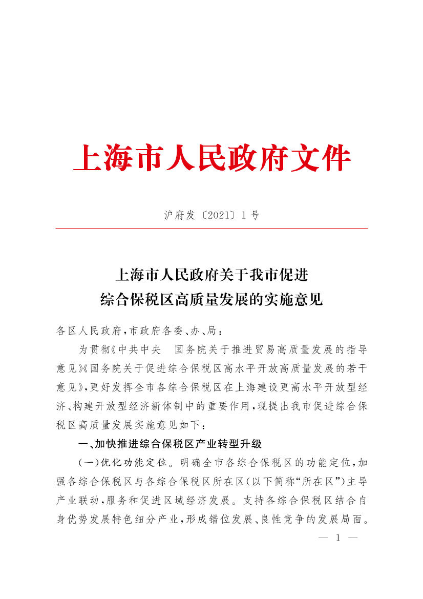 上海市人民政府关于我市促进综合保税区高质量发展的实施意见