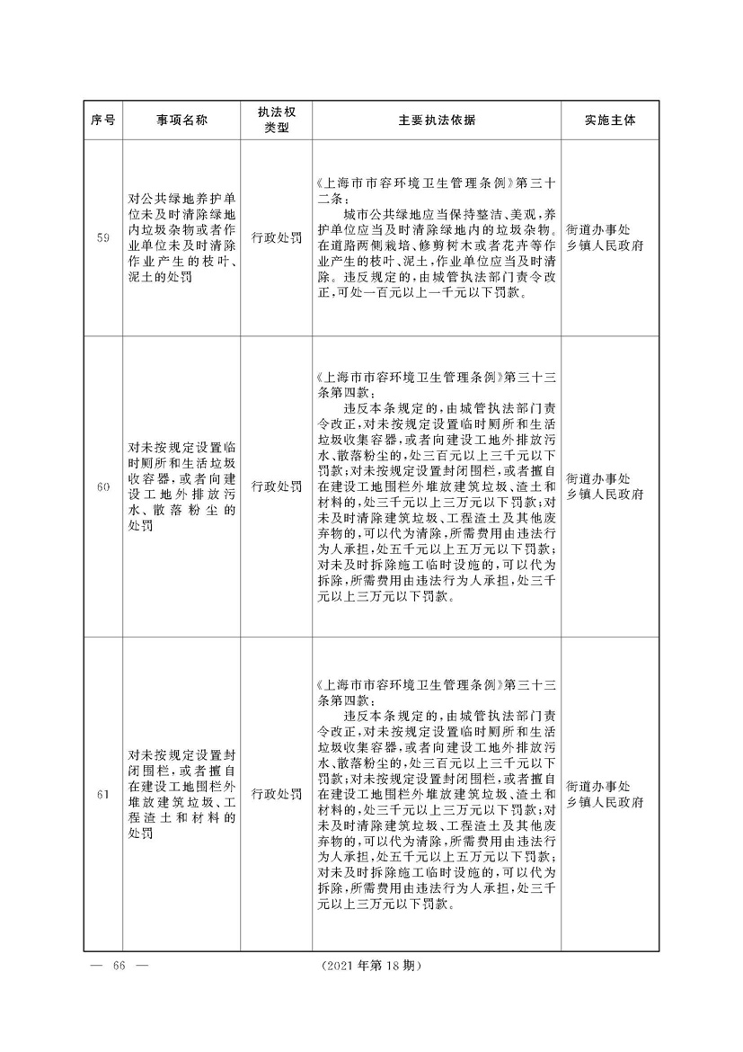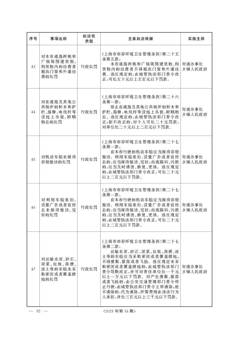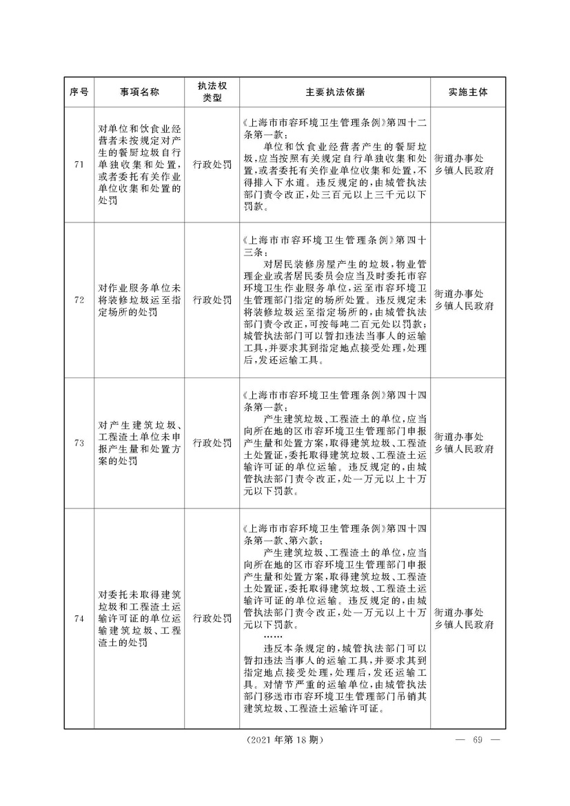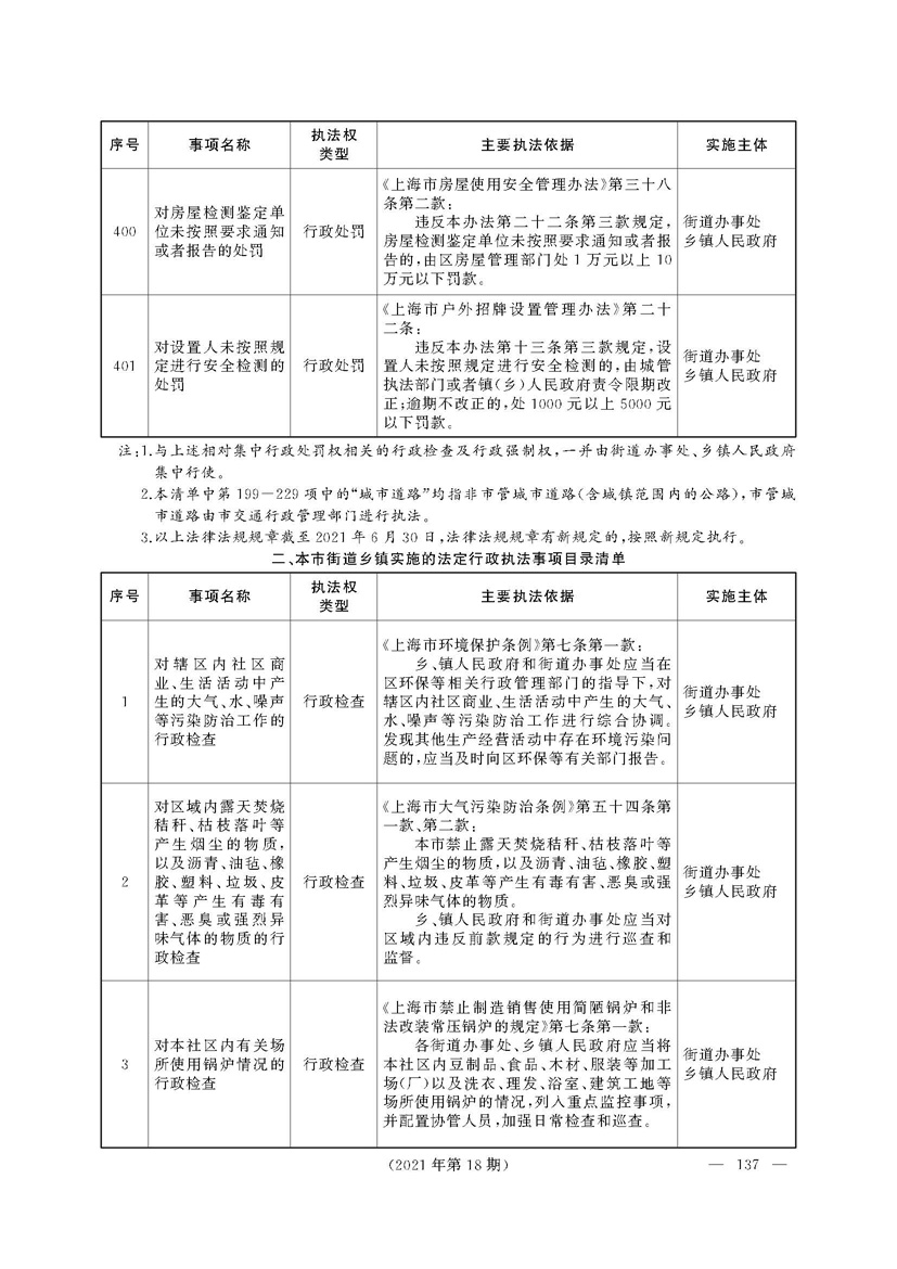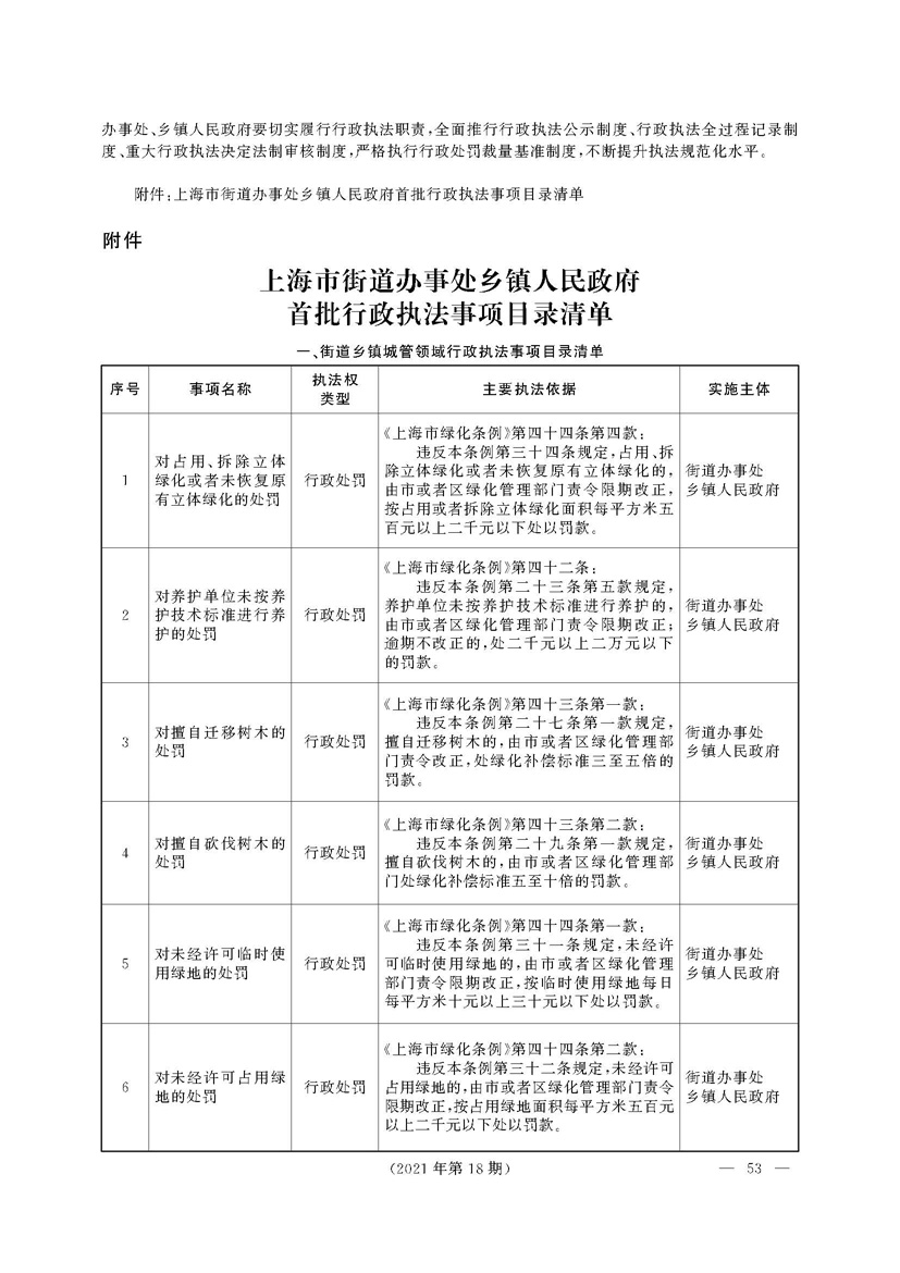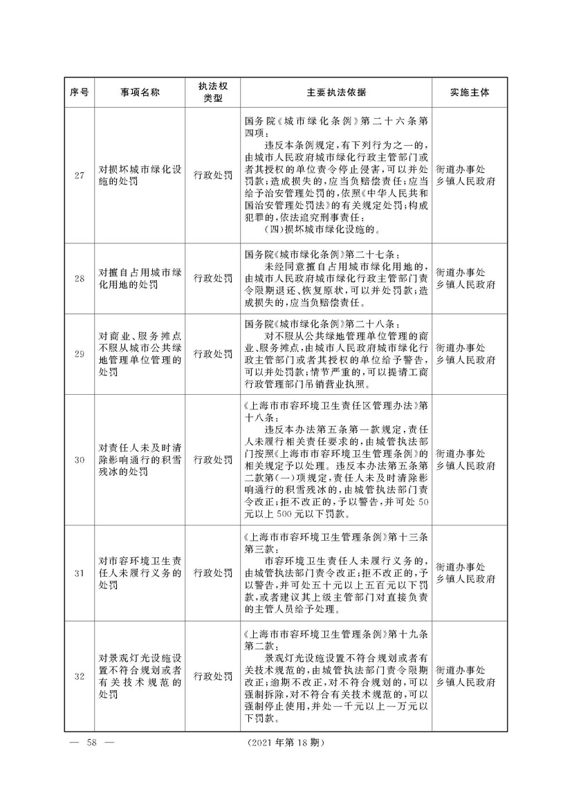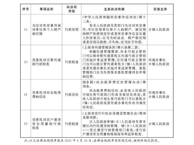 根据《中华人民共和国行政处罚法》《上海市城市管理行政执法条例》《上海市城市管理行政执法条例实施办法》等规定,市政府决定自2021年8月1日起,由街道办事处在本辖区内行使本目录清单中城管领域的行政执法权,乡镇人民政府仍以自己名义在本辖区内行使本目录清单中的行政执法事项。