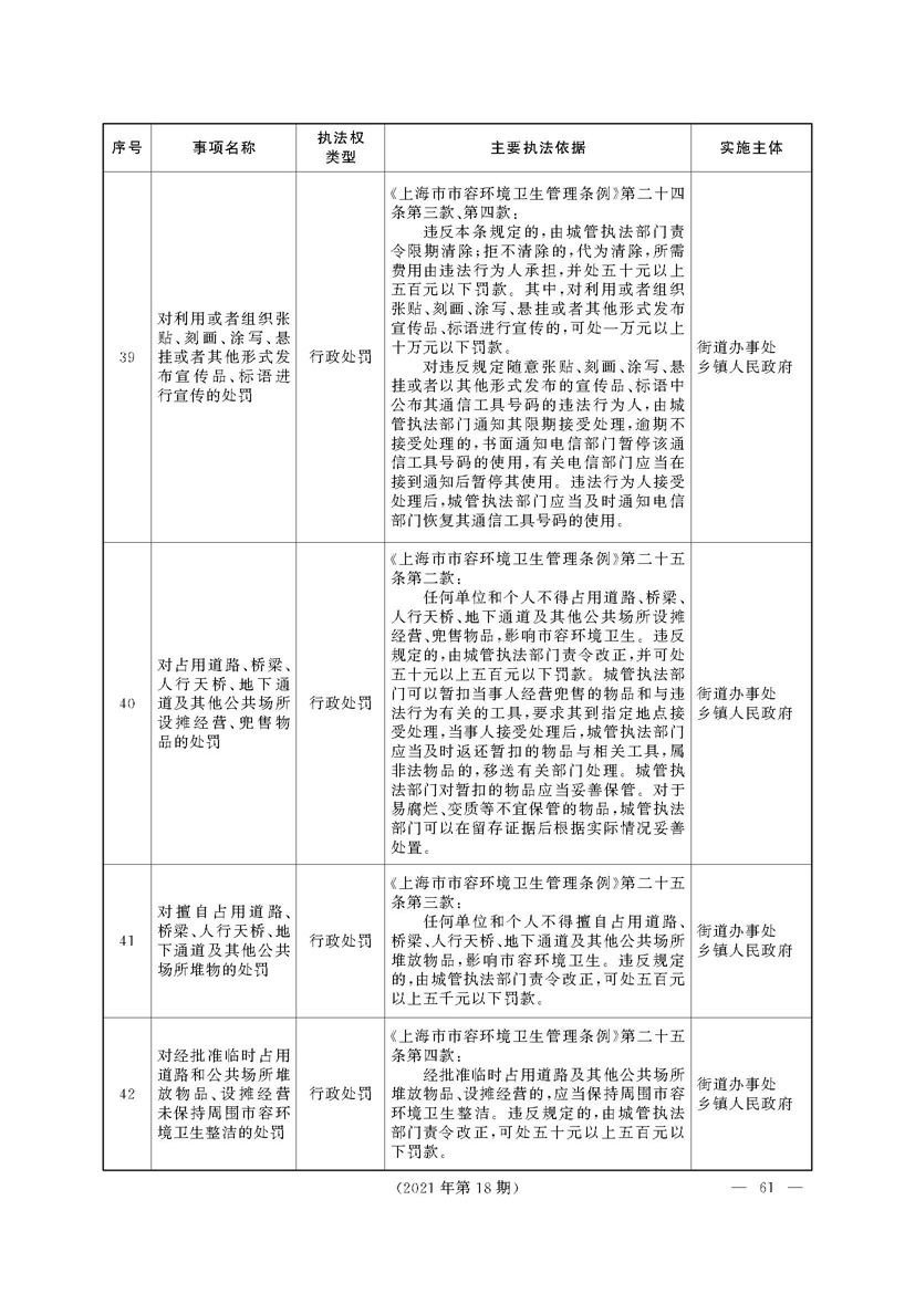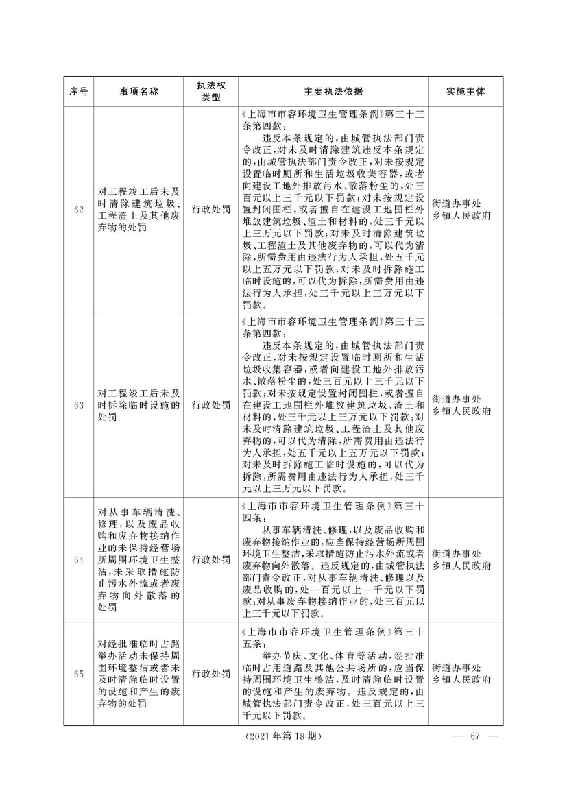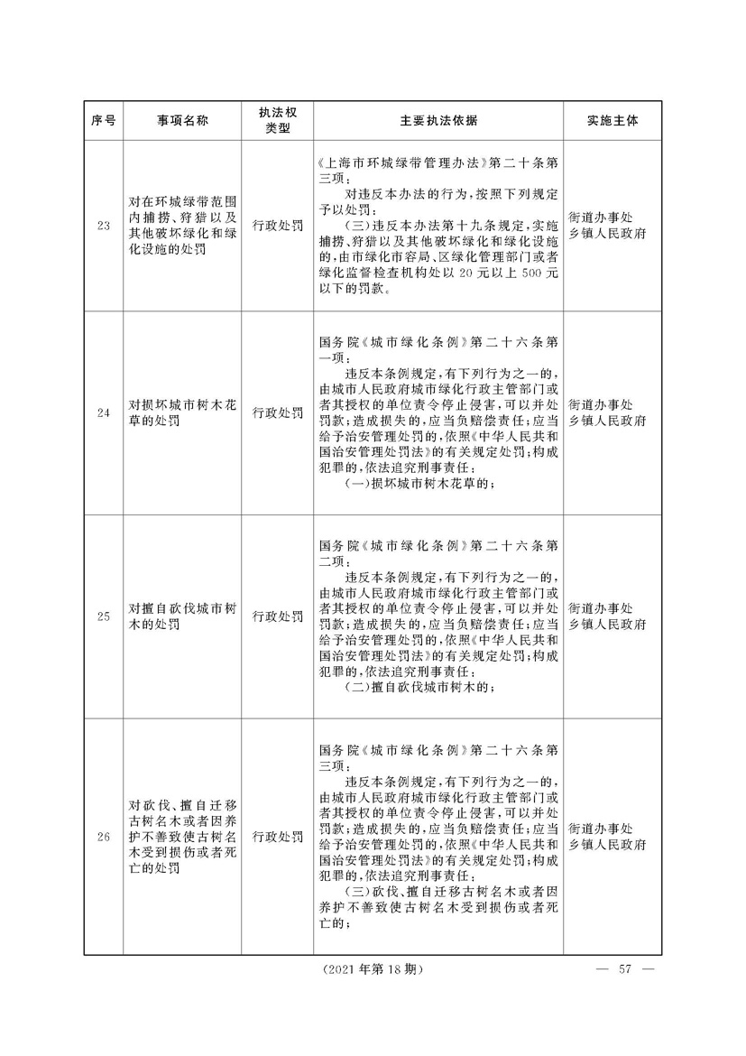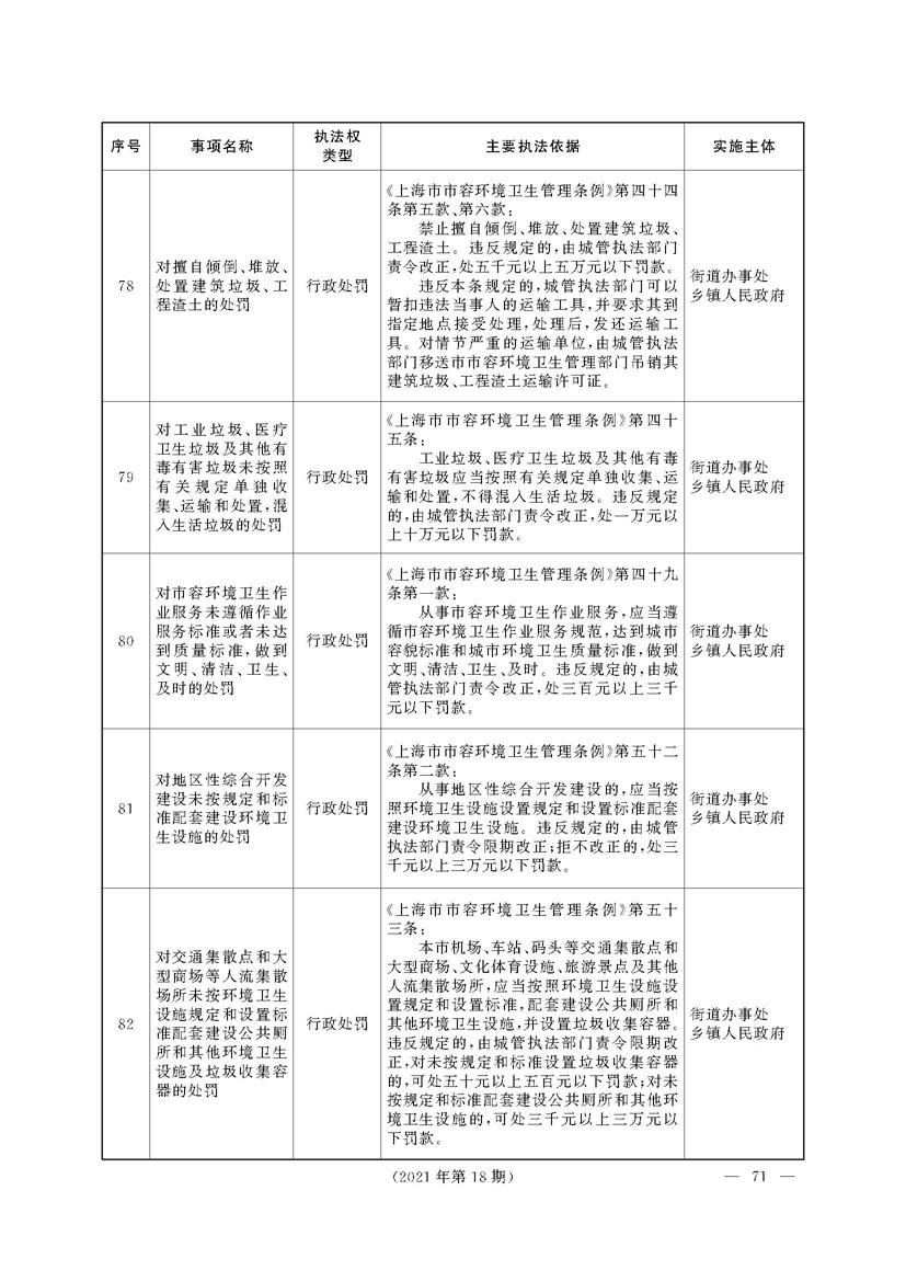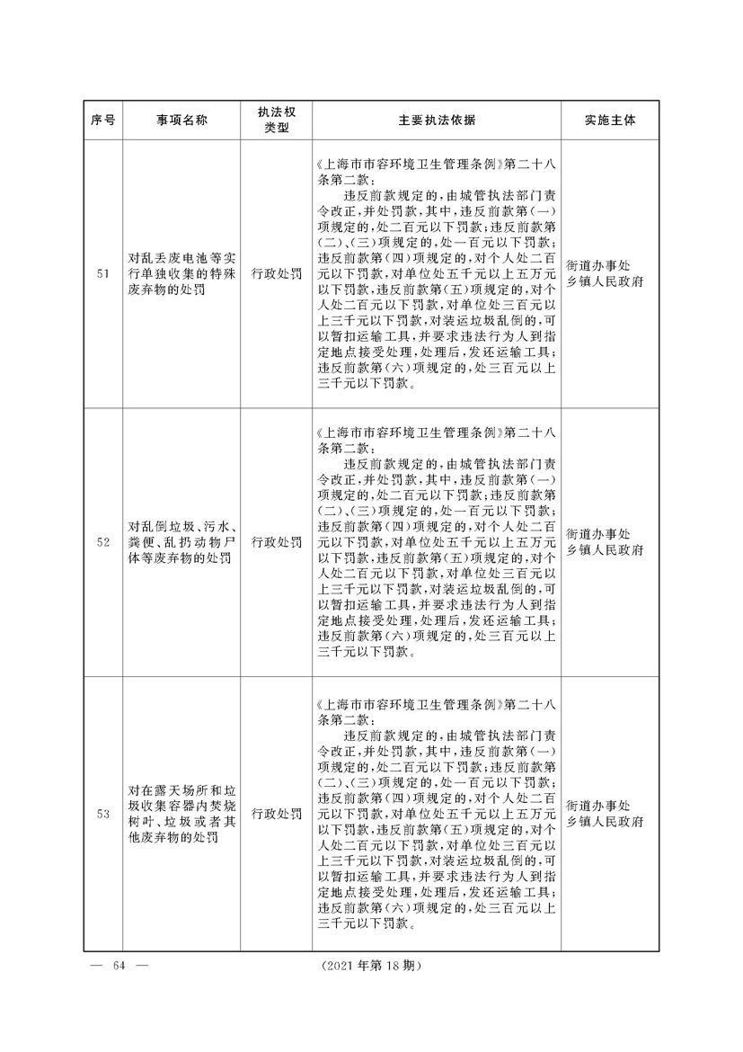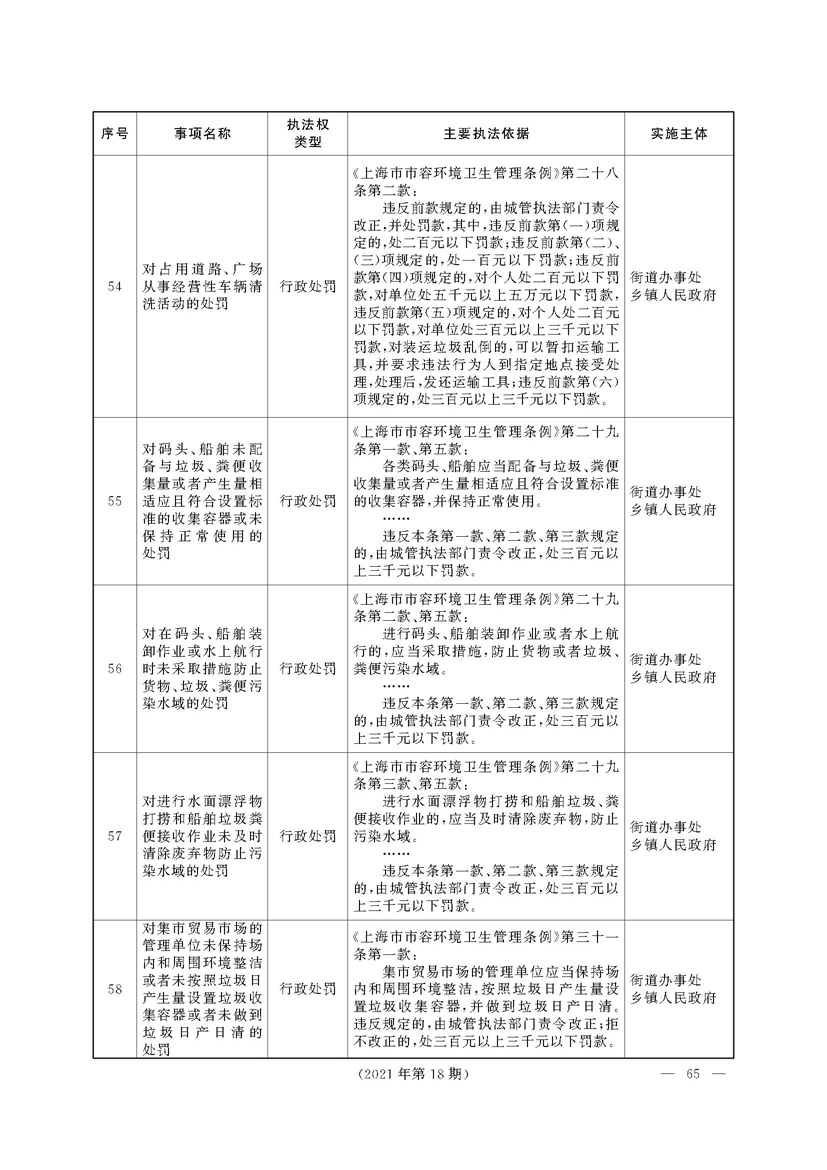 根据《中华人民共和国行政处罚法》《上海市城市管理行政执法条例》《上海市城市管理行政执法条例实施办法》等规定,市政府决定自2021年8月1日起,由街道办事处在本辖区内行使本目录清单中城管领域的行政执法权,乡镇人民政府仍以自己名义在本辖区内行使本目录清单中的行政执法事项。