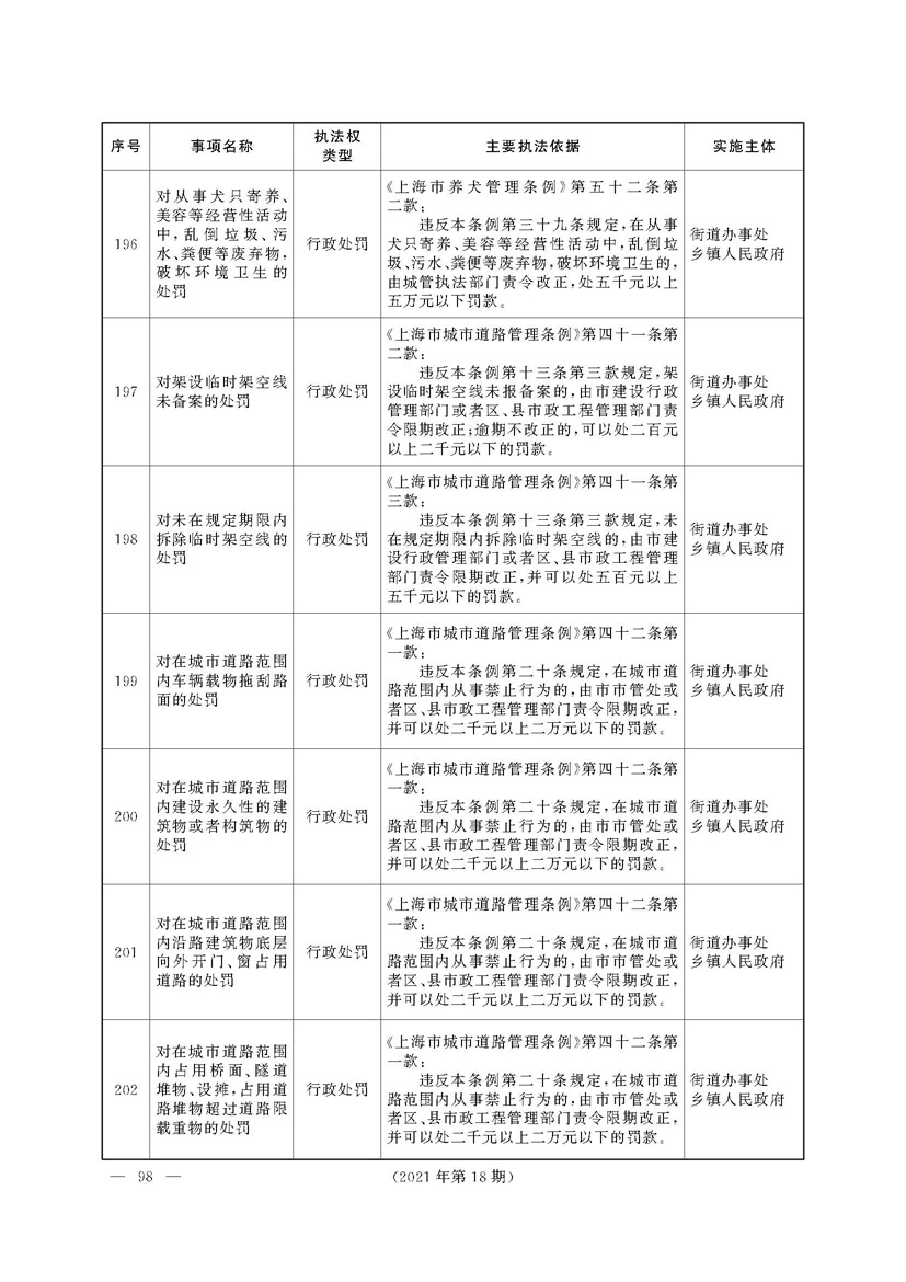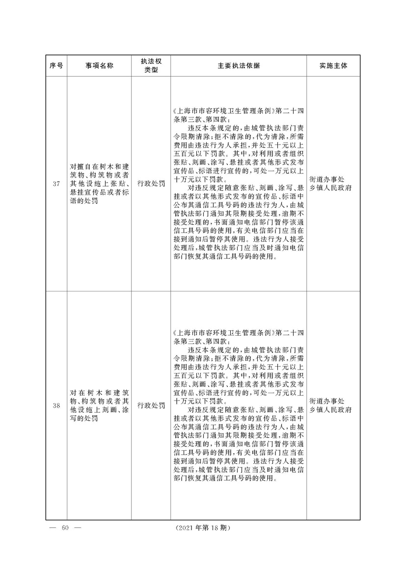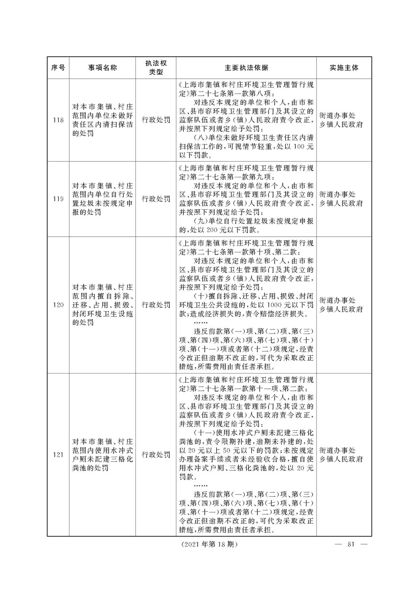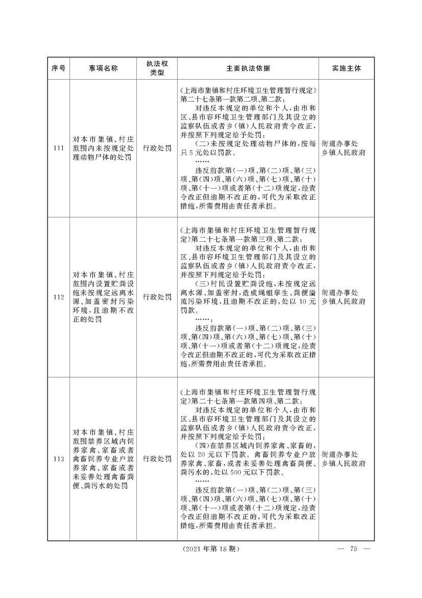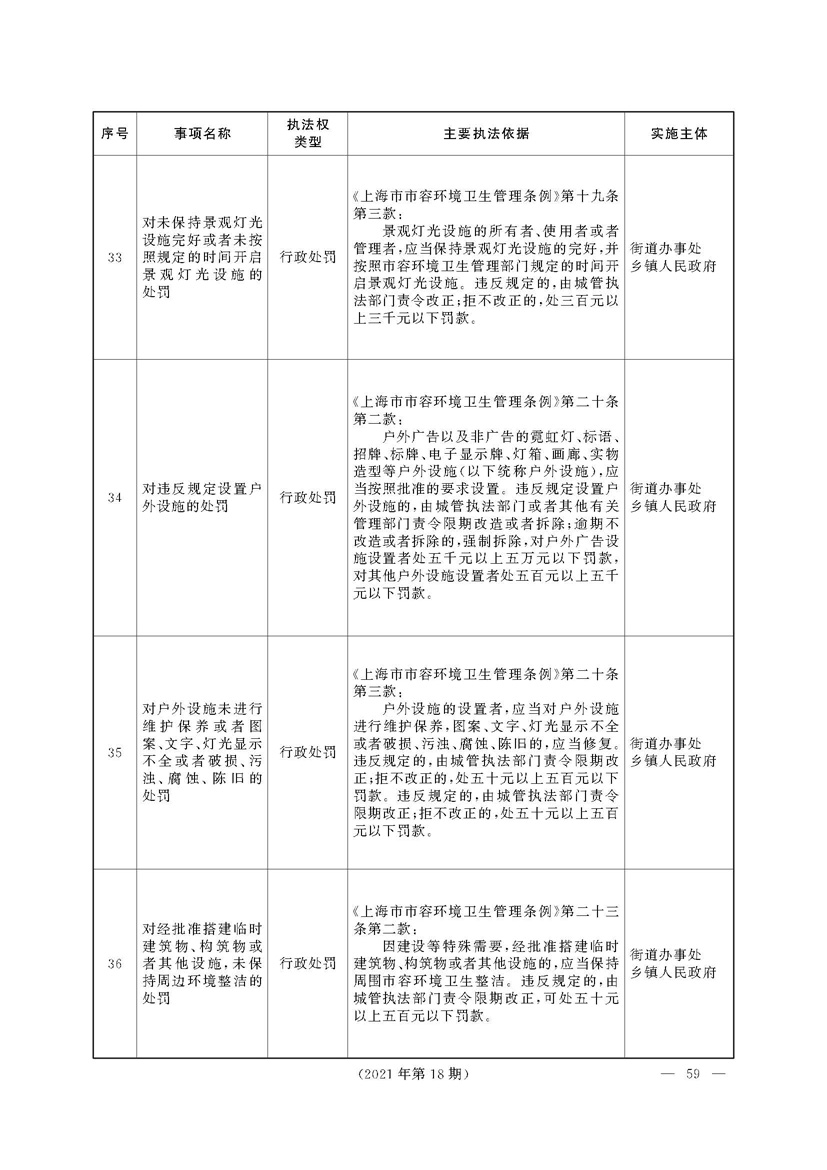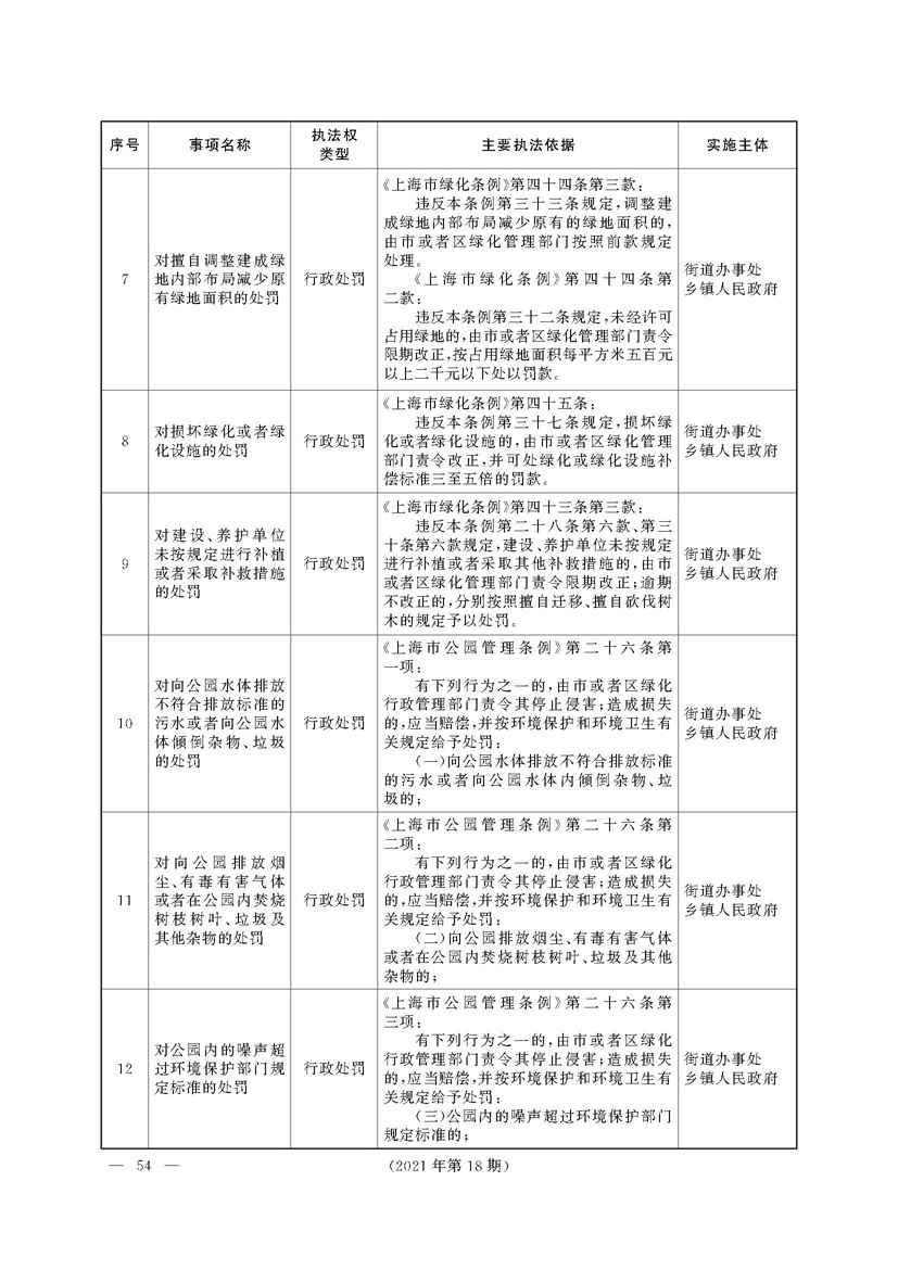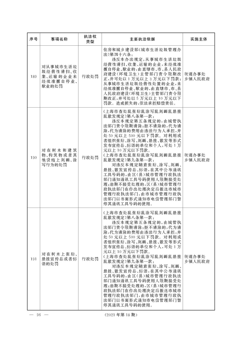 根据《中华人民共和国行政处罚法》《上海市城市管理行政执法条例》《上海市城市管理行政执法条例实施办法》等规定,市政府决定自2021年8月1日起,由街道办事处在本辖区内行使本目录清单中城管领域的行政执法权,乡镇人民政府仍以自己名义在本辖区内行使本目录清单中的行政执法事项。
