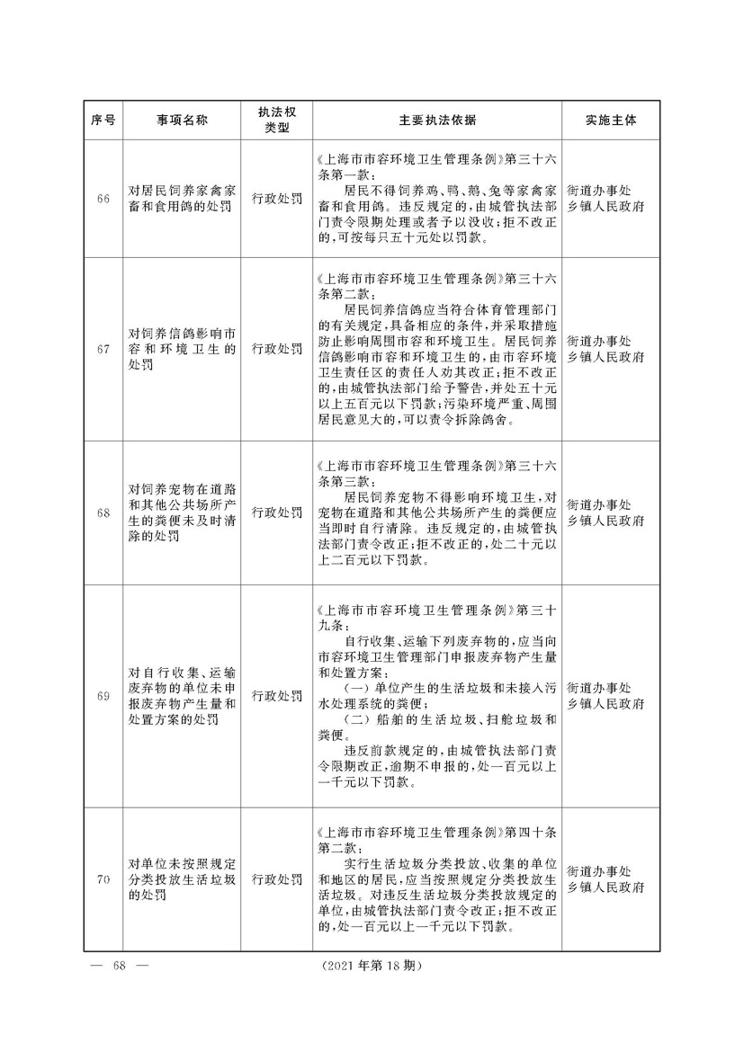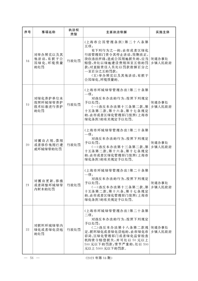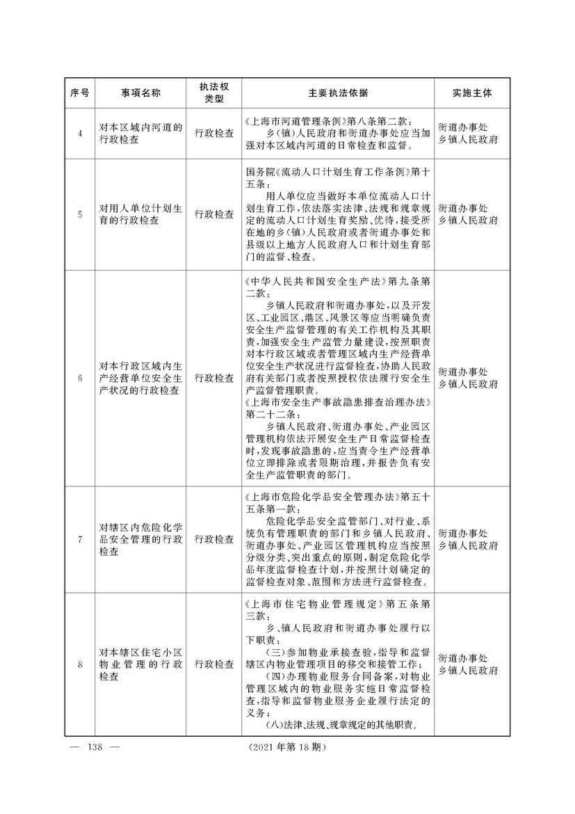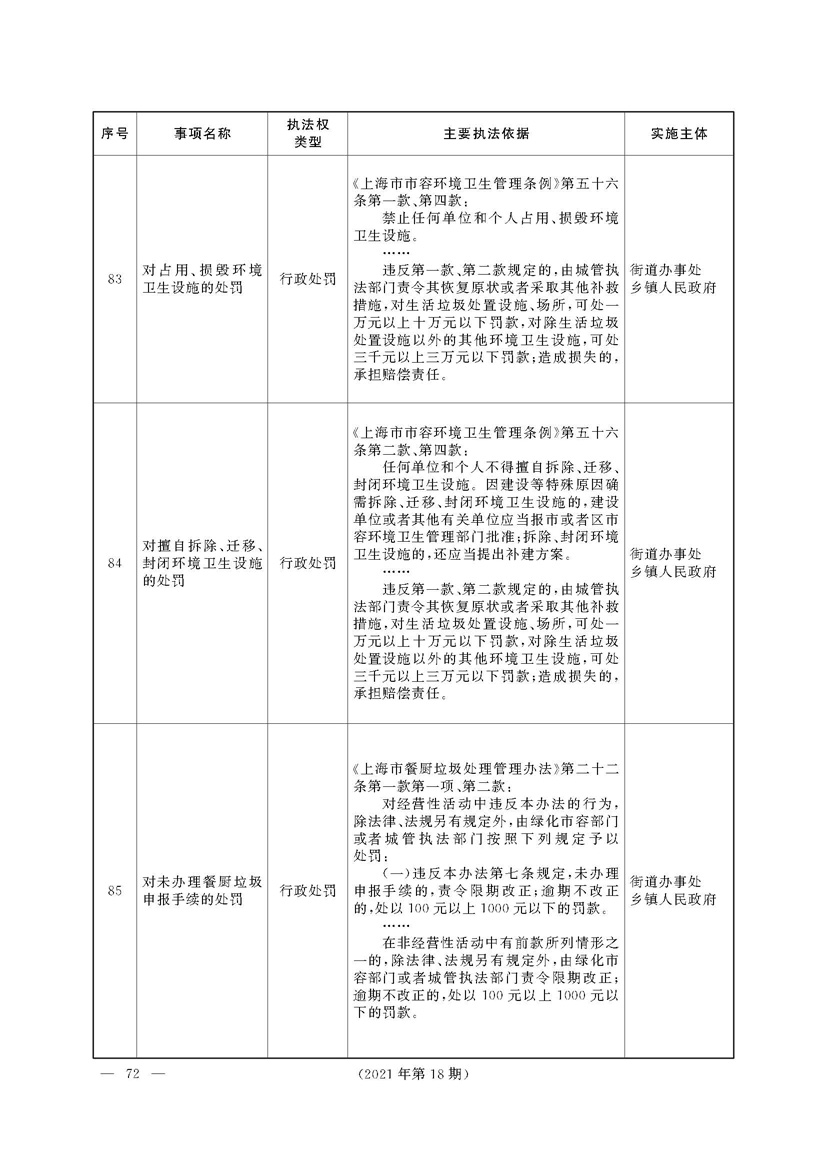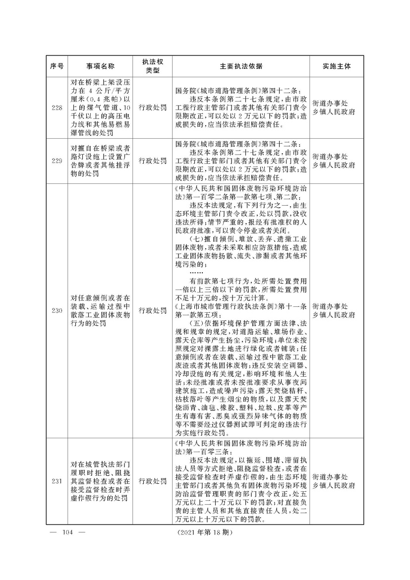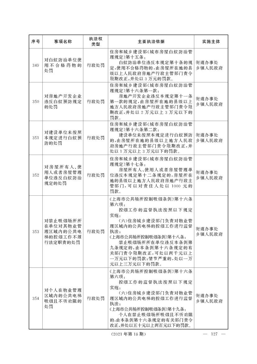 根据《中华人民共和国行政处罚法》《上海市城市管理行政执法条例》《上海市城市管理行政执法条例实施办法》等规定,市政府决定自2021年8月1日起,由街道办事处在本辖区内行使本目录清单中城管领域的行政执法权,乡镇人民政府仍以自己名义在本辖区内行使本目录清单中的行政执法事项。