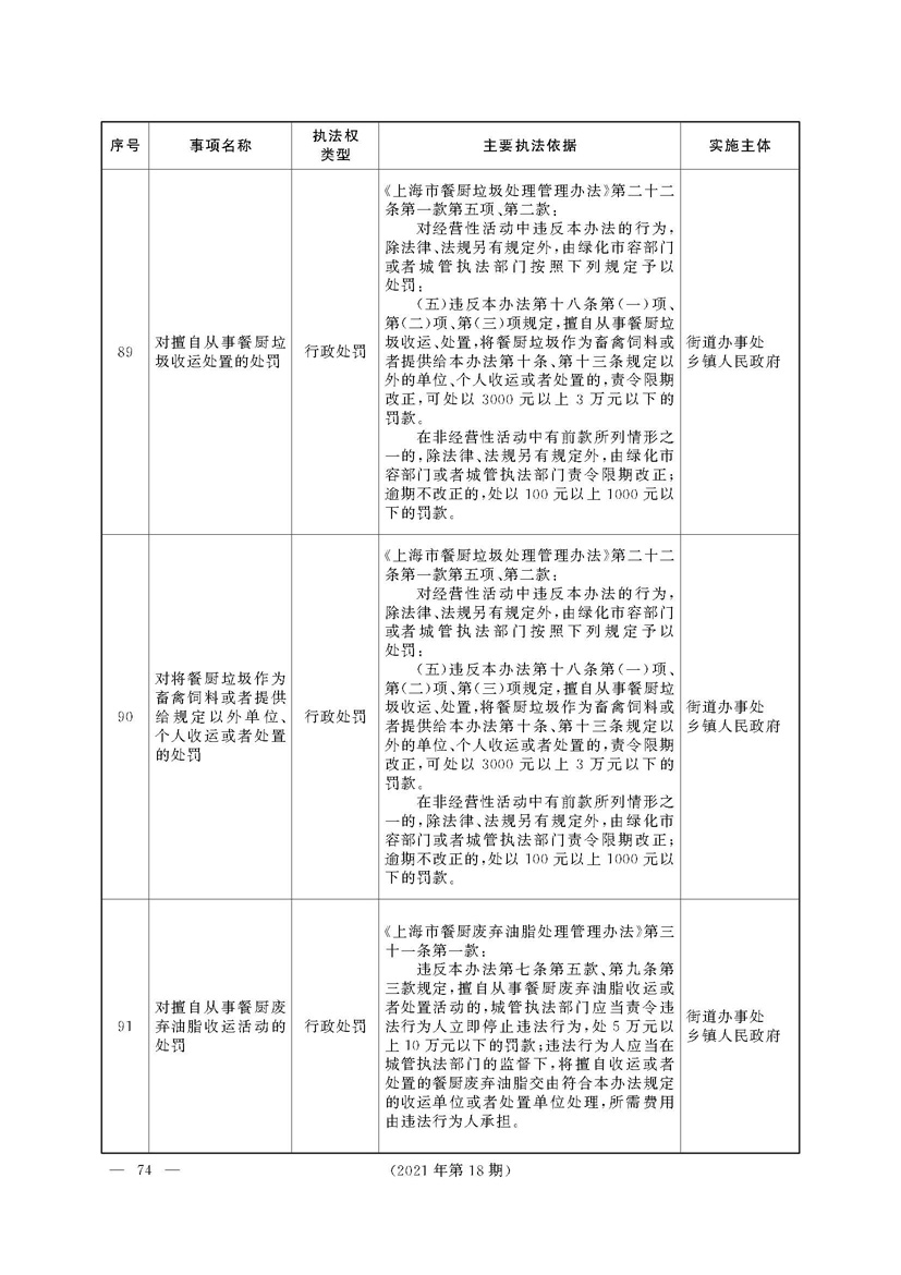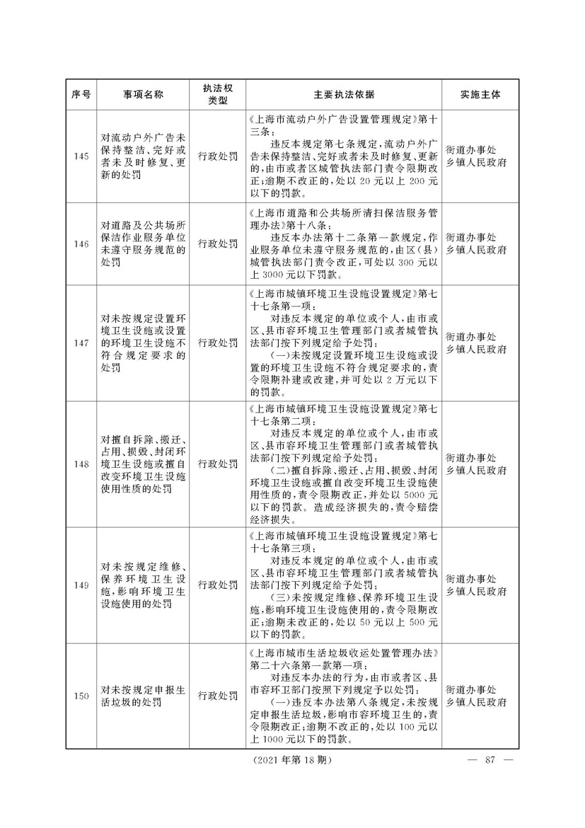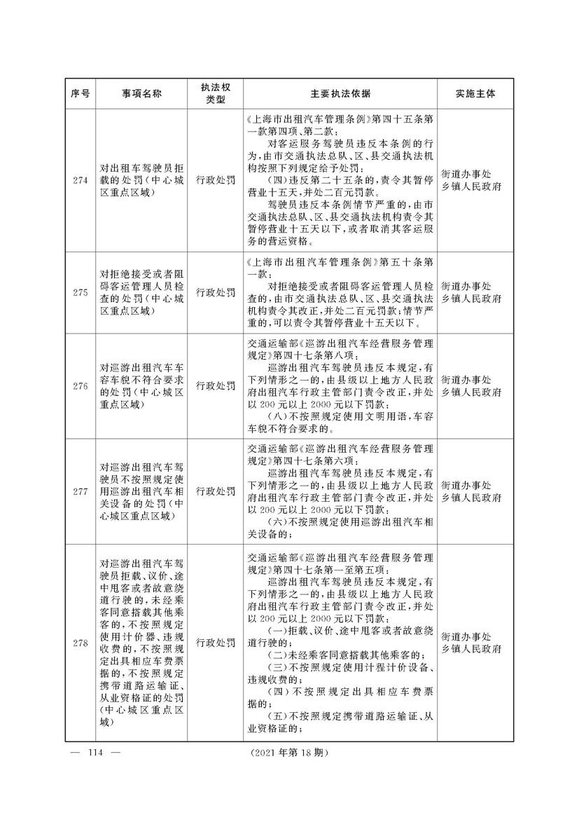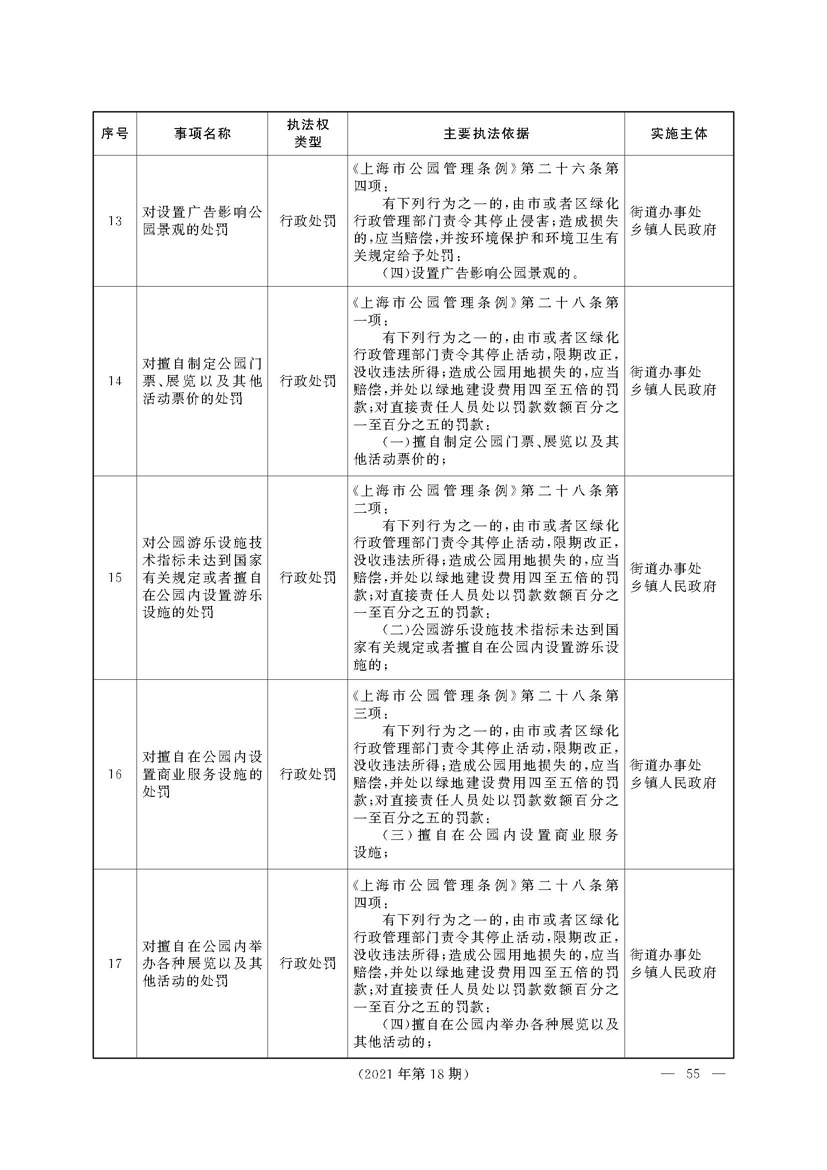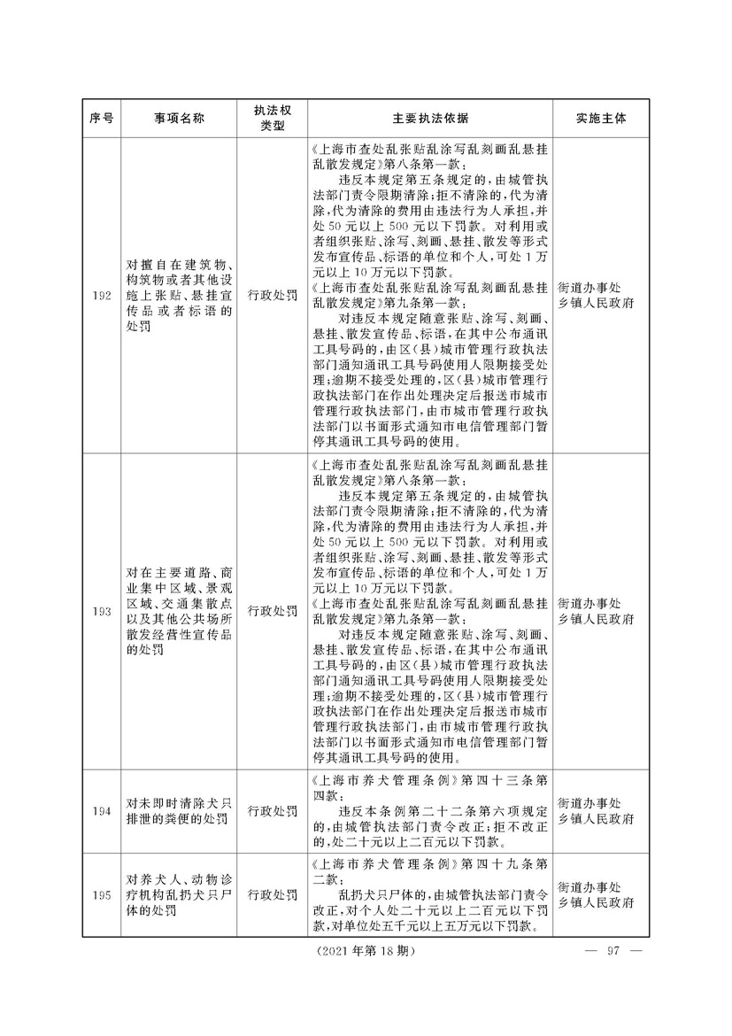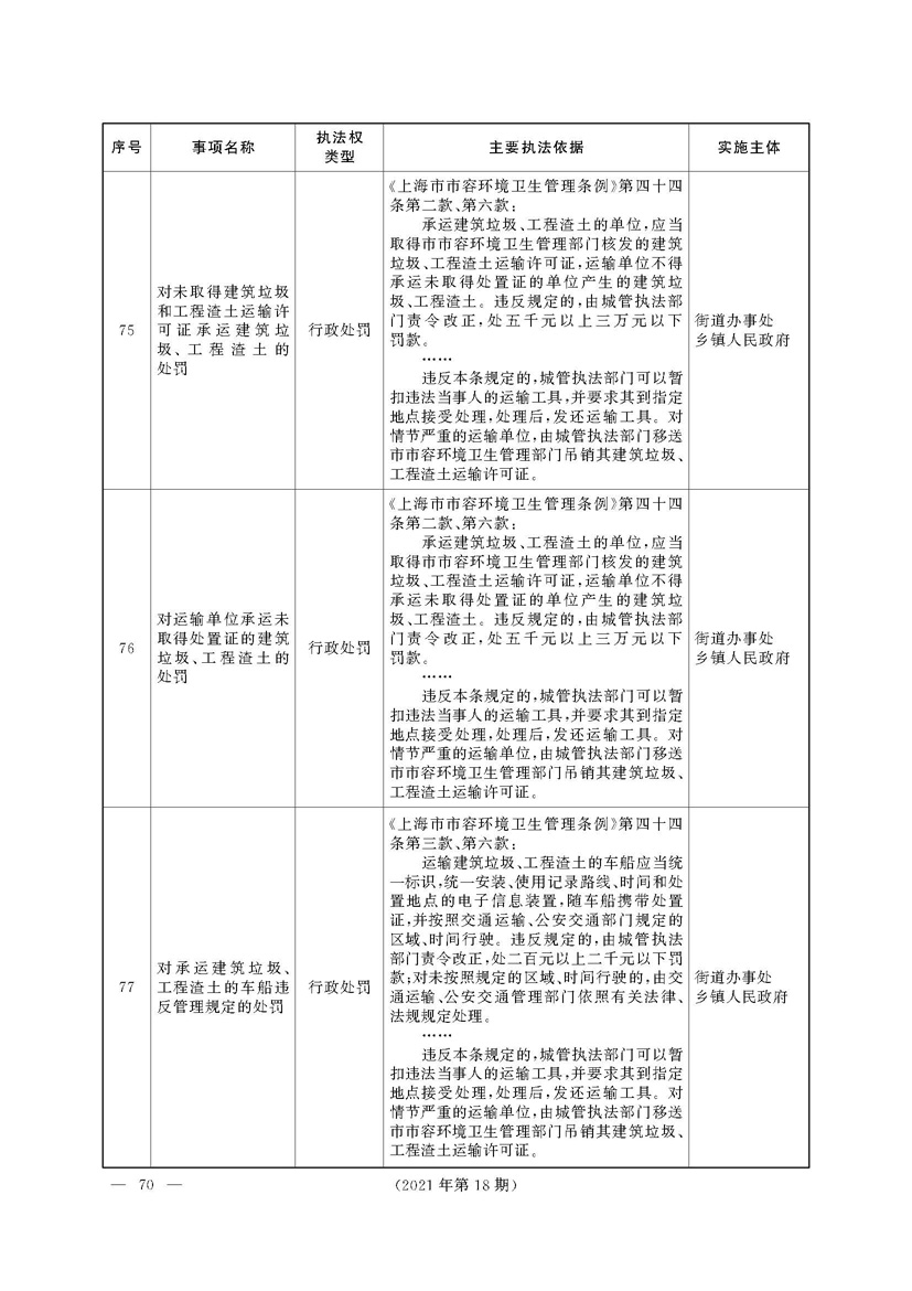 根据《中华人民共和国行政处罚法》《上海市城市管理行政执法条例》《上海市城市管理行政执法条例实施办法》等规定,市政府决定自2021年8月1日起,由街道办事处在本辖区内行使本目录清单中城管领域的行政执法权,乡镇人民政府仍以自己名义在本辖区内行使本目录清单中的行政执法事项。