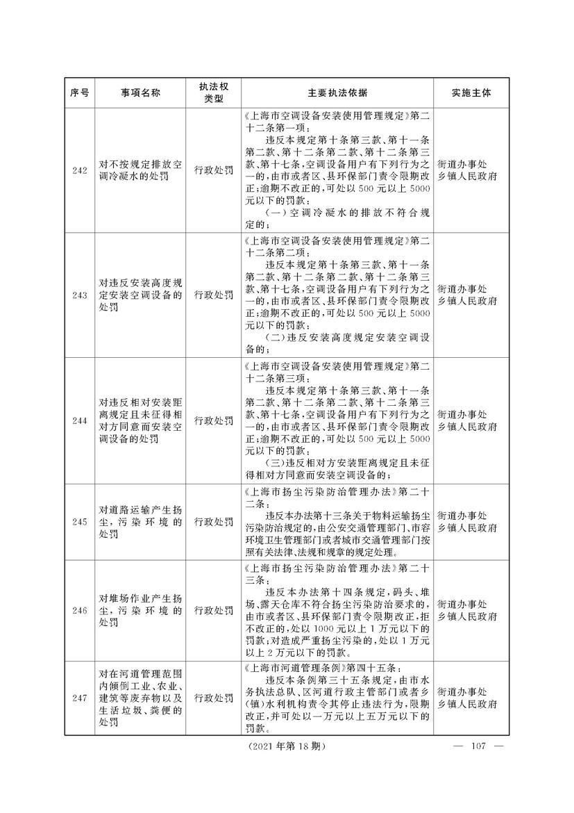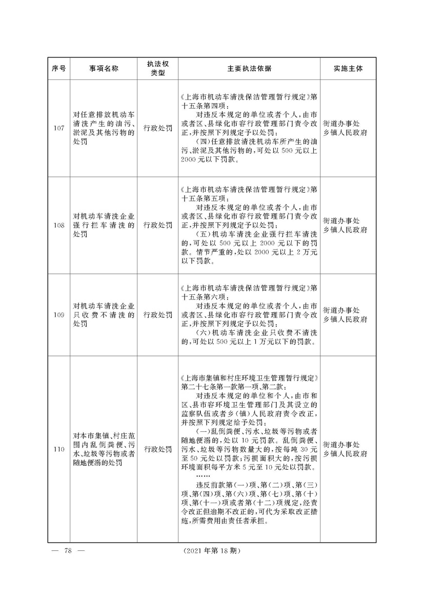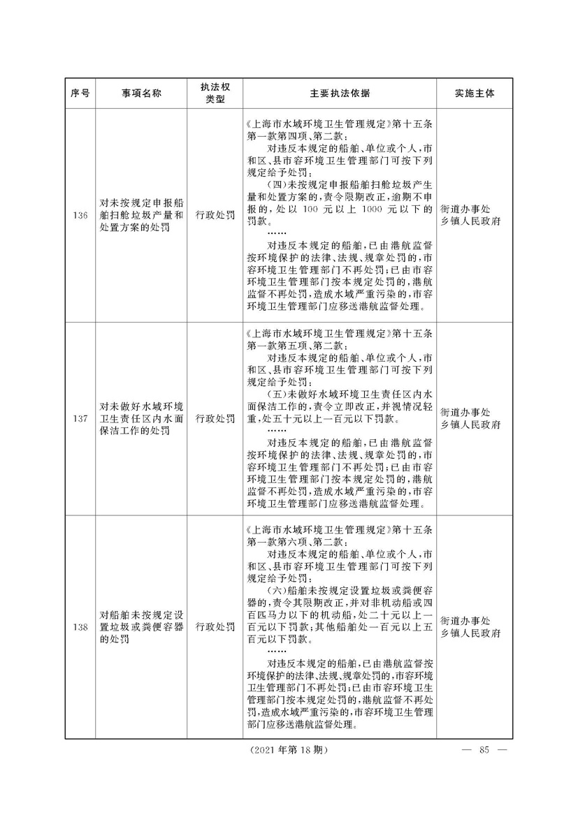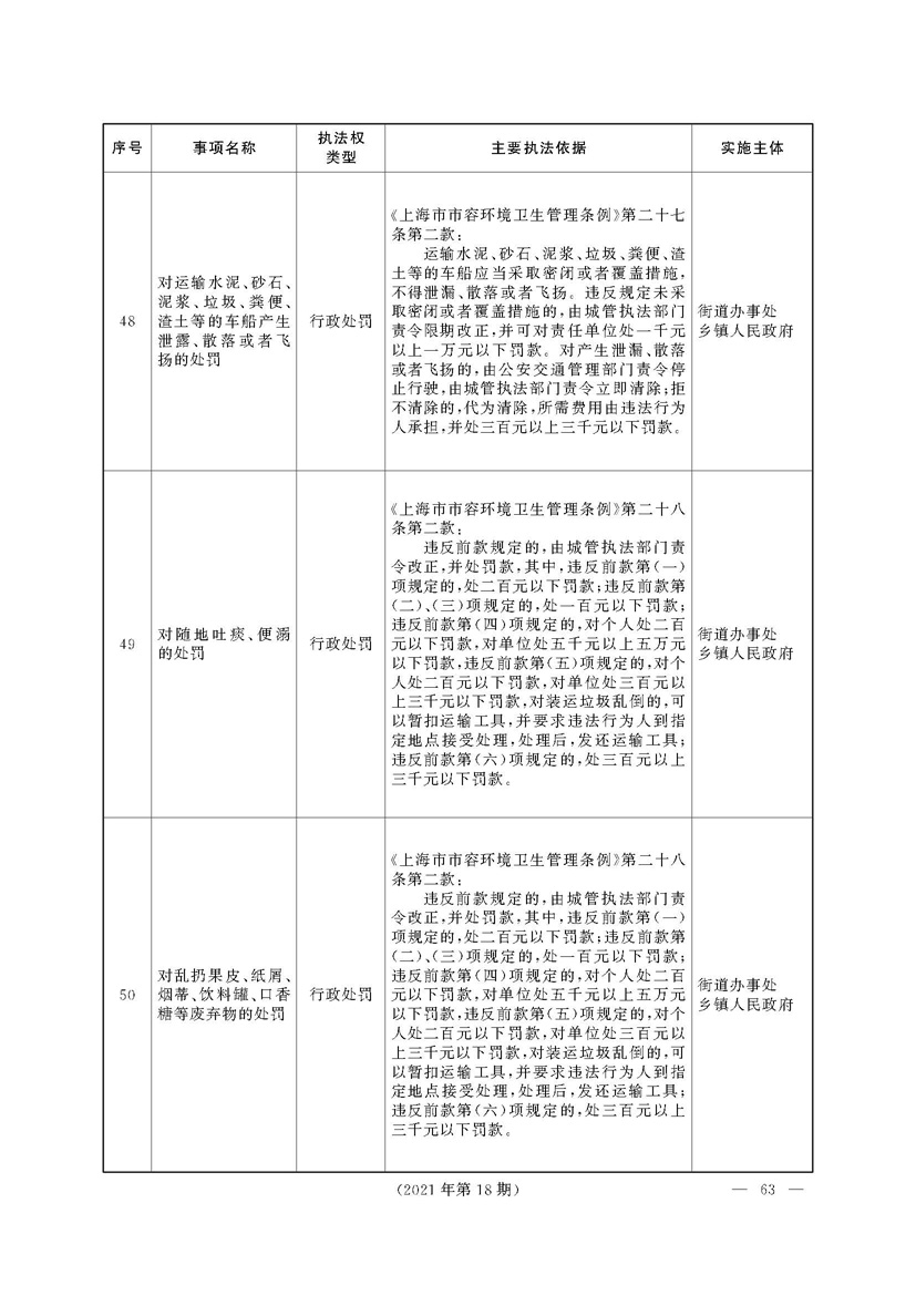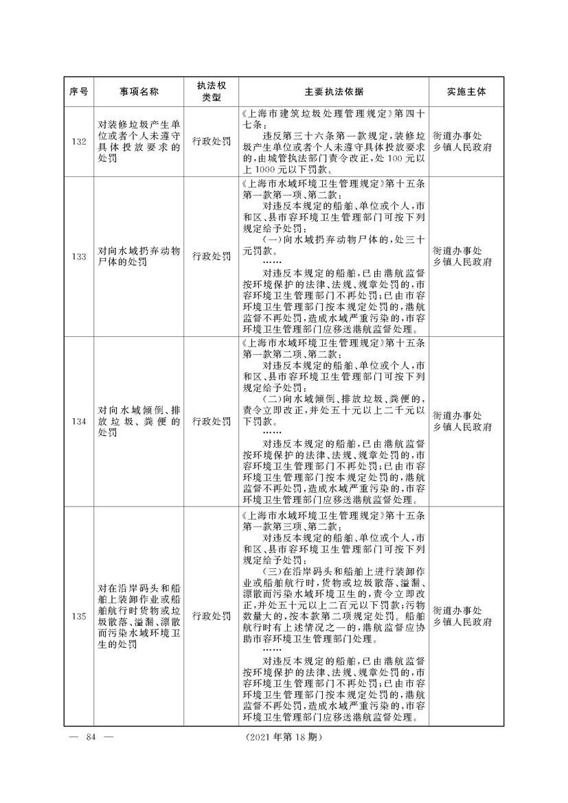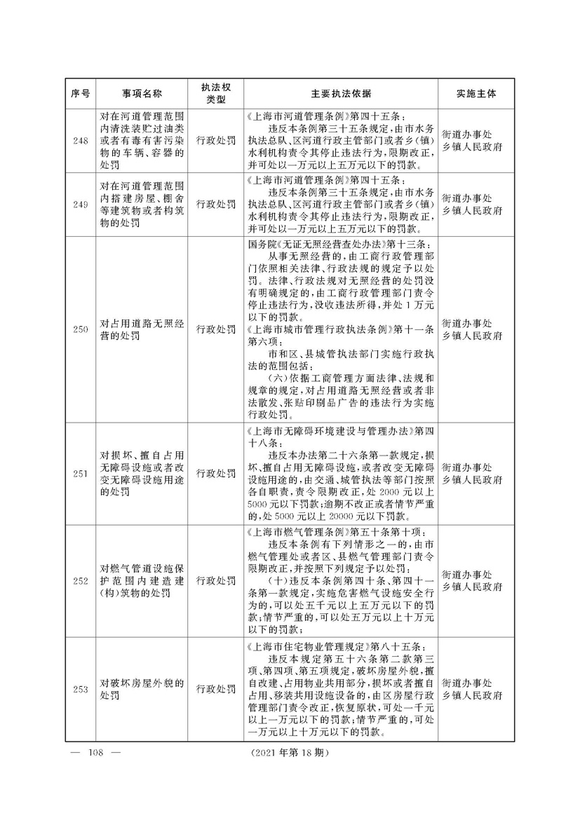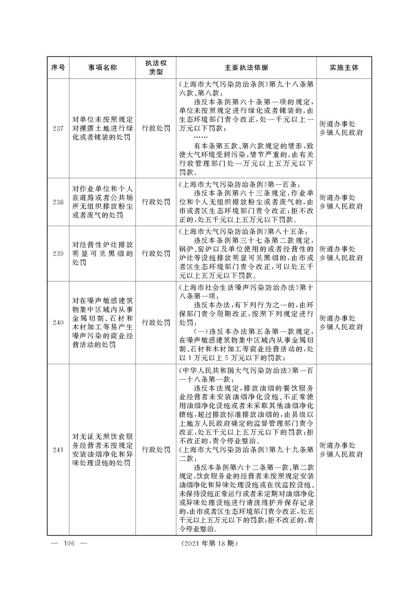根据《中华人民共和国行政处罚法》《上海市城市管理行政执法条例》《上海市城市管理行政执法条例实施办法》等规定,市政府决定自2021年8月1日起,由街道办事处在本辖区内行使本目录清单中城管领域的行政执法权,乡镇人民政府仍以自己名义在本辖区内行使本目录清单中的行政执法事项。
