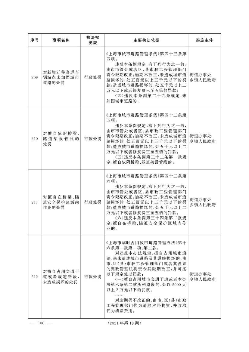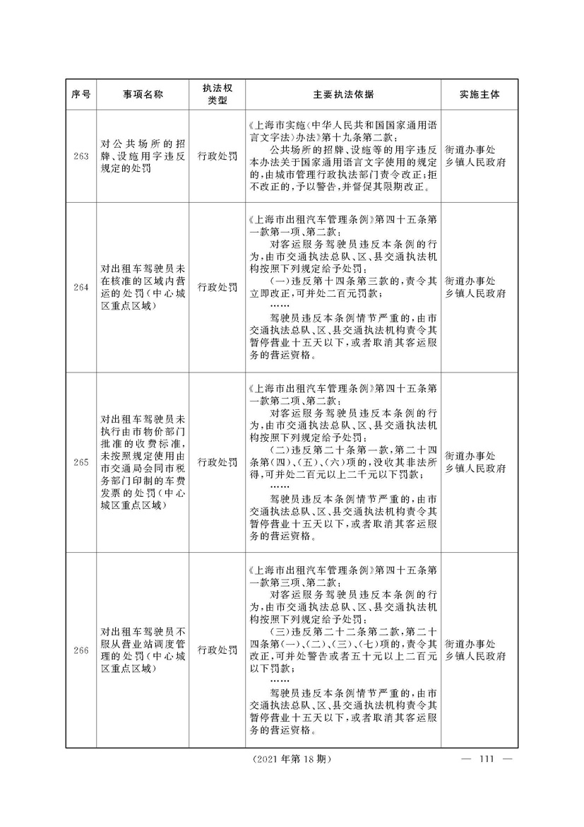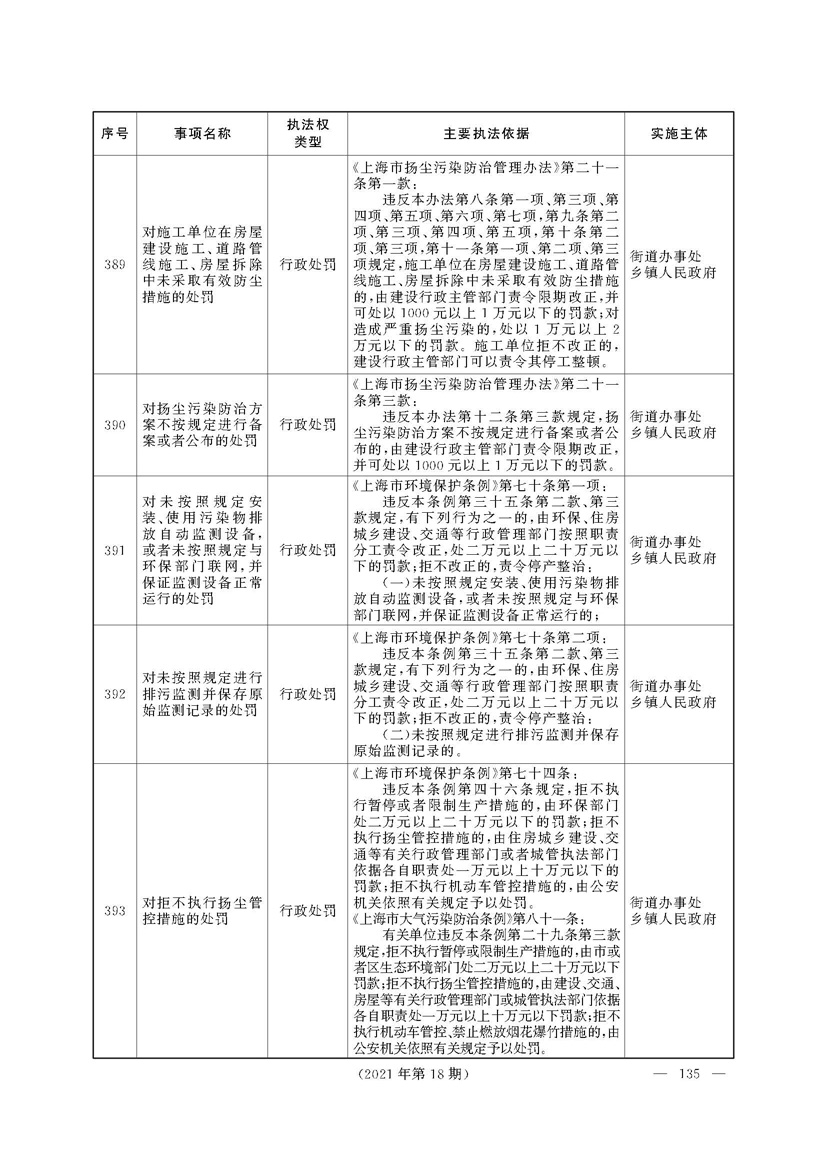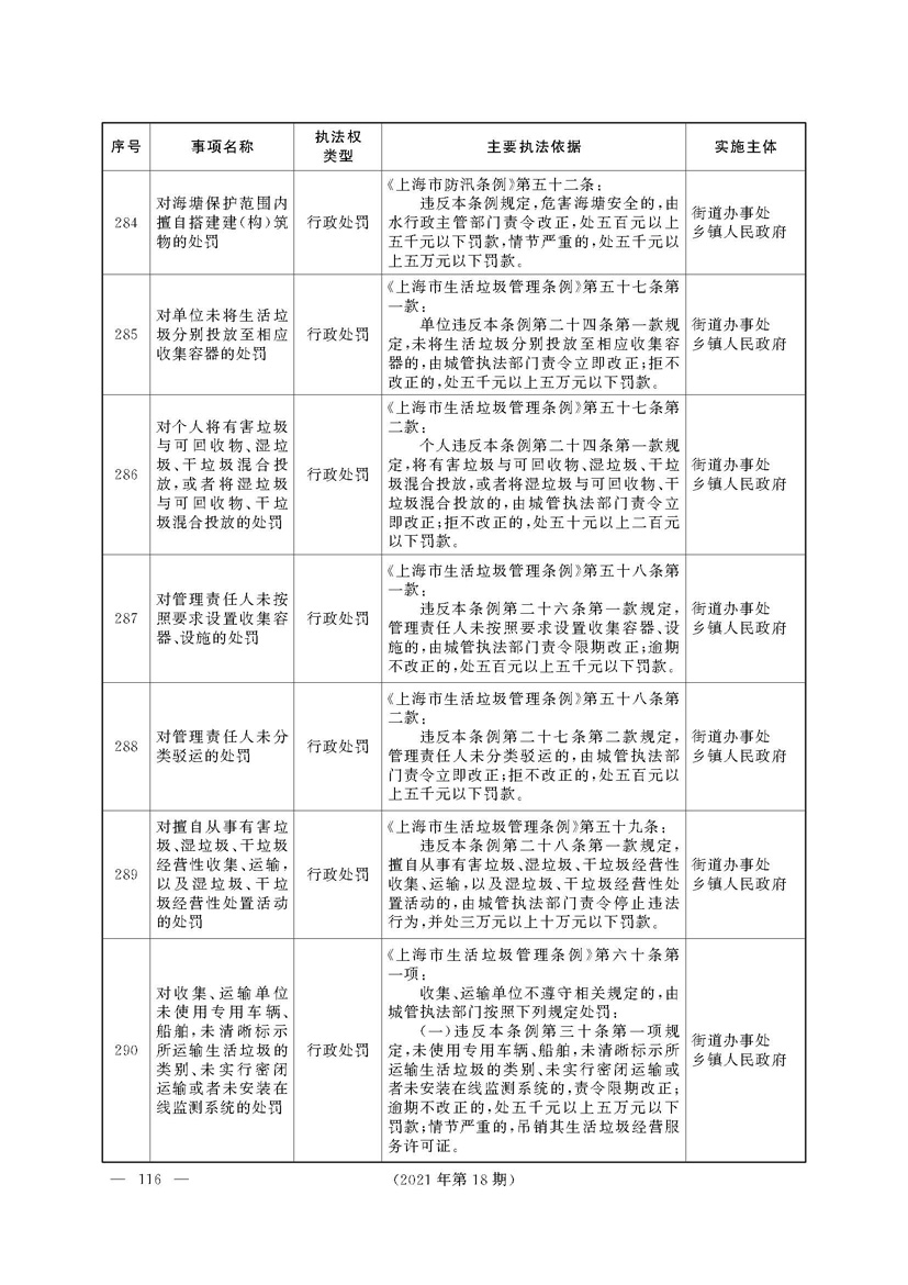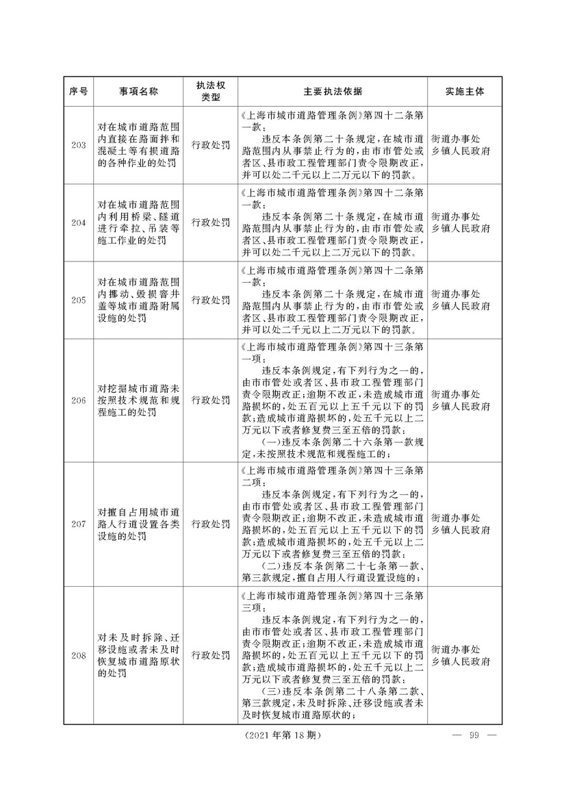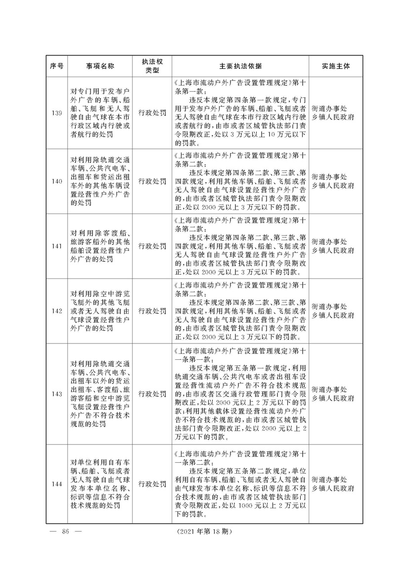 根据《中华人民共和国行政处罚法》《上海市城市管理行政执法条例》《上海市城市管理行政执法条例实施办法》等规定,市政府决定自2021年8月1日起,由街道办事处在本辖区内行使本目录清单中城管领域的行政执法权,乡镇人民政府仍以自己名义在本辖区内行使本目录清单中的行政执法事项。