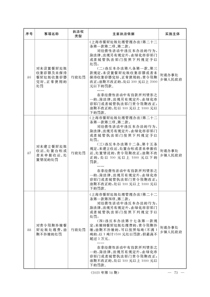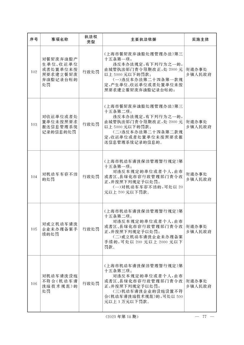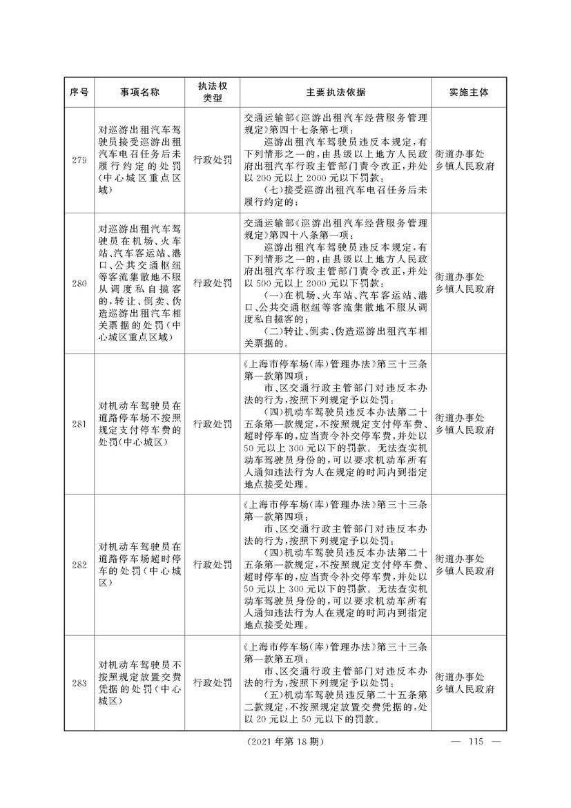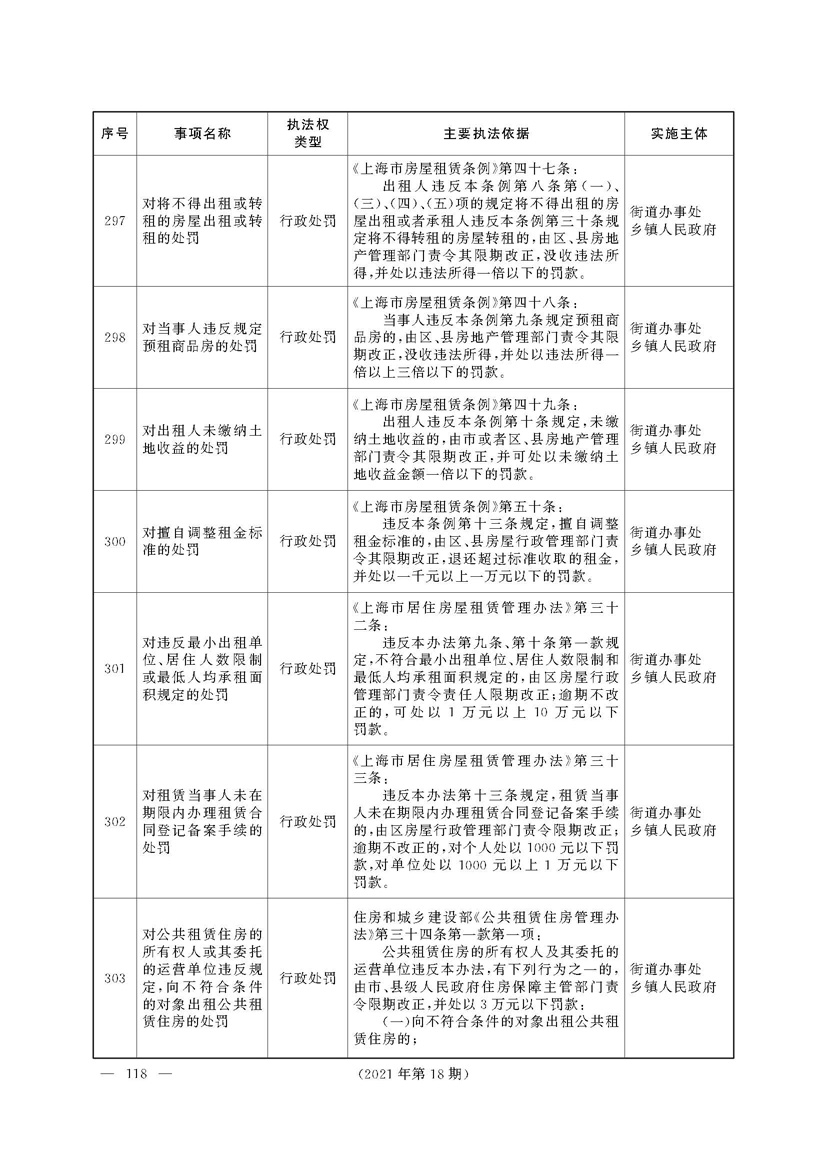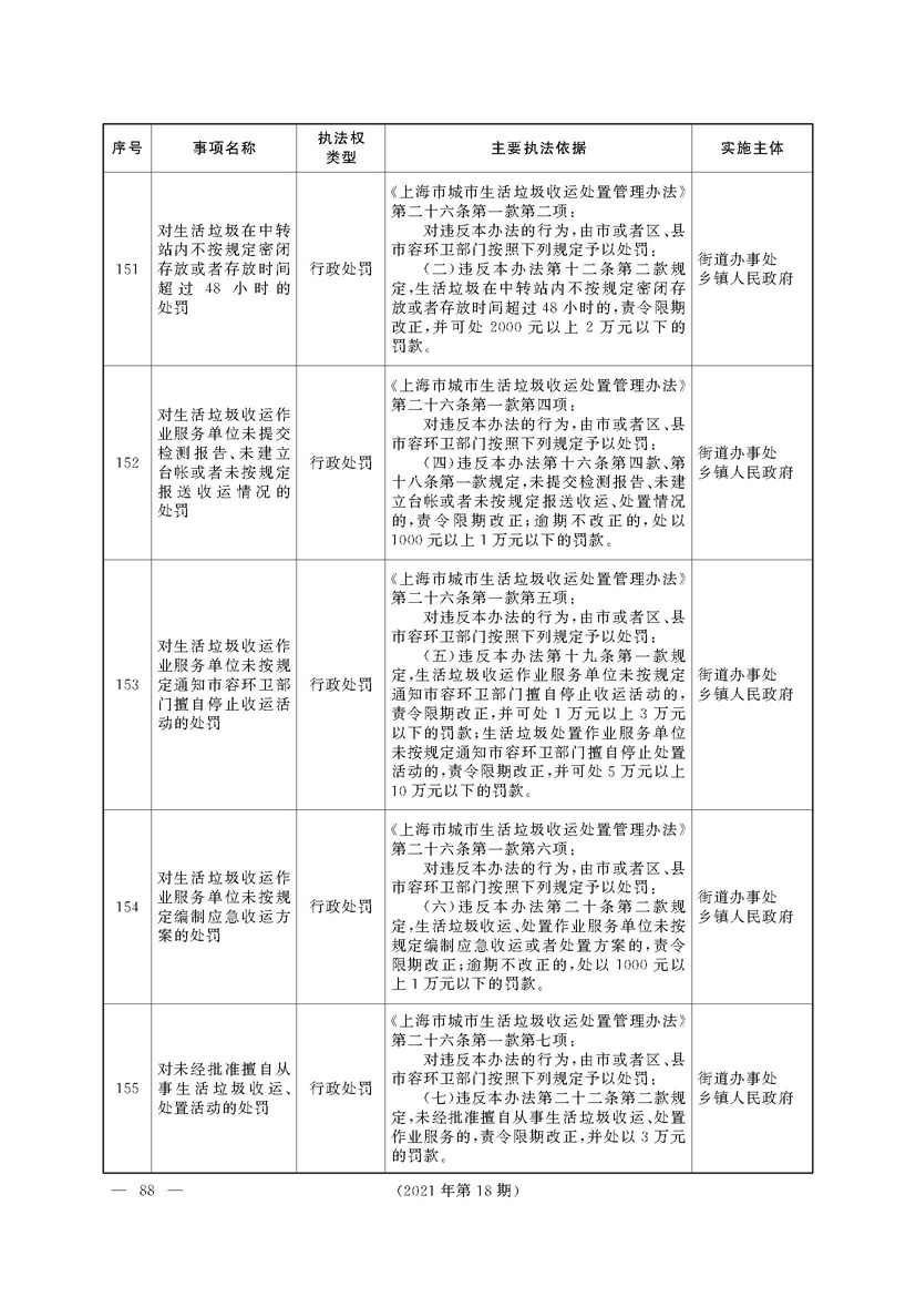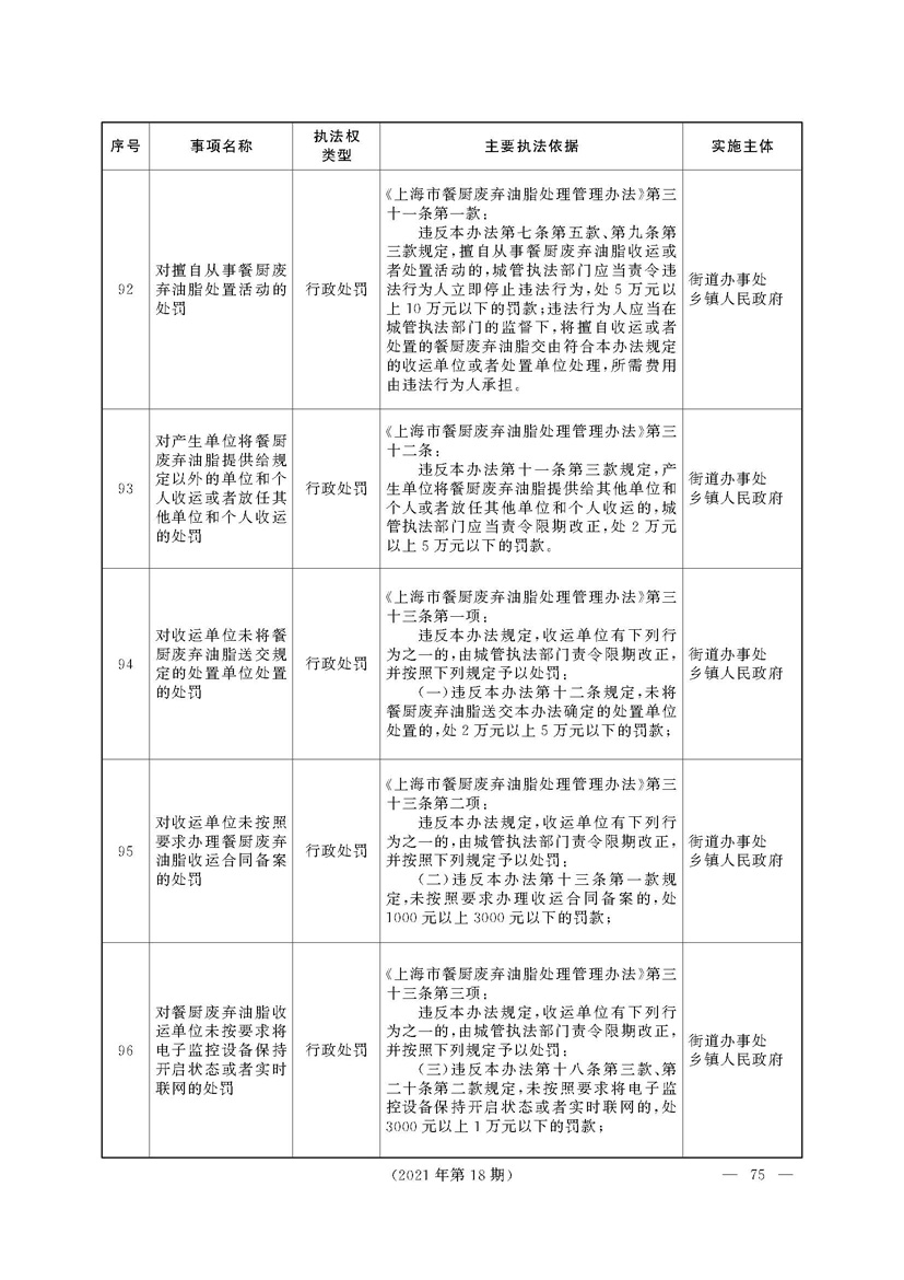 根据《中华人民共和国行政处罚法》《上海市城市管理行政执法条例》《上海市城市管理行政执法条例实施办法》等规定,市政府决定自2021年8月1日起,由街道办事处在本辖区内行使本目录清单中城管领域的行政执法权,乡镇人民政府仍以自己名义在本辖区内行使本目录清单中的行政执法事项。