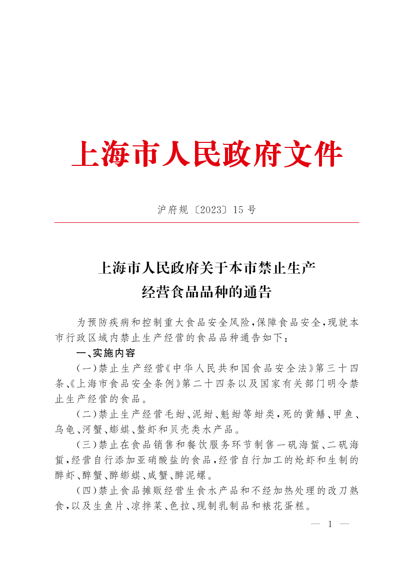 上海市人民政府关于本市禁止生产经营食品品种的通告