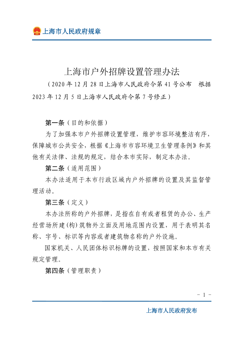 为了加强本市户外招牌设置管理,维护市容环境整洁有序,保障城市公共安全,根据《上海市市容环境卫生管理条例》和其他有关法律、法规的规定,结合本市实际,制定本办法。