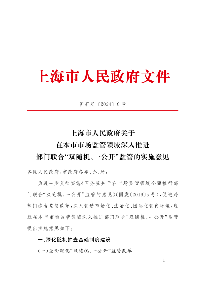 为进一步贯彻实施《国务院关于在市场监管领域全面推行部门联合“双随机、一公开”监管的意见》(国发〔2019〕5号),促进跨部门综合监管改革,深入营造市场化、法治化、国际化营商环境,现就在本市市场监管领域深入推进部门联合“双随机、一公开”监管提出实施意见如下: