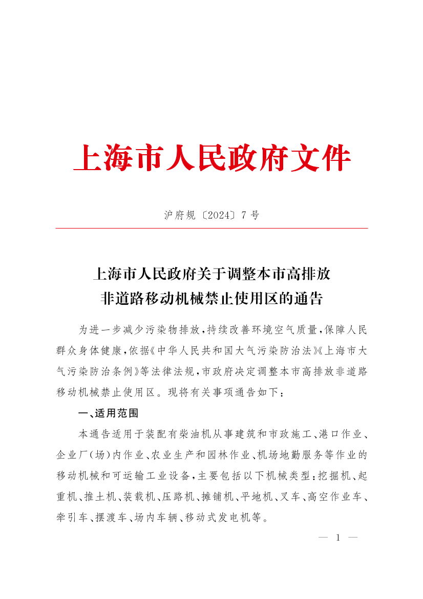为进一步减少污染物排放,持续改善环境空气质量,保障人民群众身体健康,依据《中华人民共和国大气污染防治法》《上海市大气污染防治条例》等法律法规,市政府决定调整本市高排放非道路移动机械禁止使用区。现将有关事项通告如下: