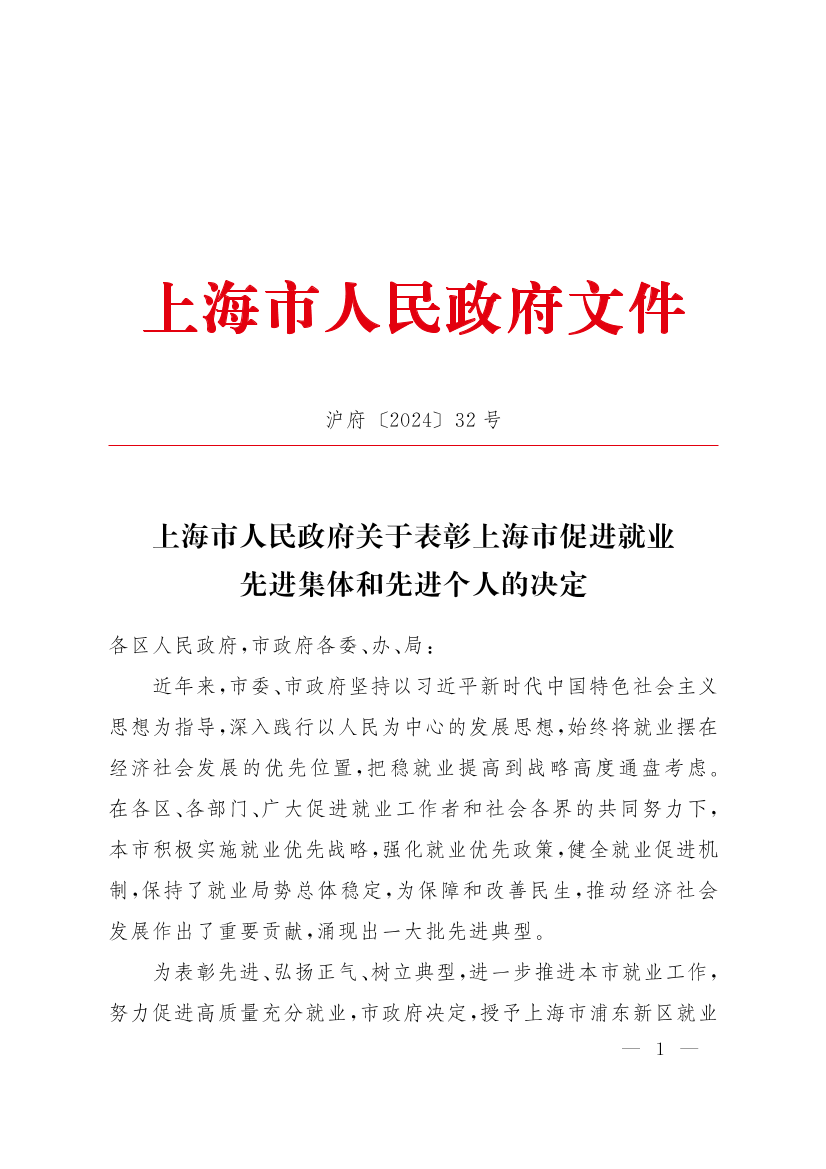 为表彰先进、弘扬正气、树立典型,进一步推进本市就业工作,努力促进高质量充分就业,市政府决定,授予上海市浦东新区就业促进中心等100家单位“上海市促进就业先进集体”称号,授予丁良等100人“上海市促进就业先进工作者”称号,授予上海清美绿色食品(集团)有限公司等50家单位“上海市促进就业先进企业(组织)”称号,授予丁维等50人“上海市就业创业优秀个人”称号。