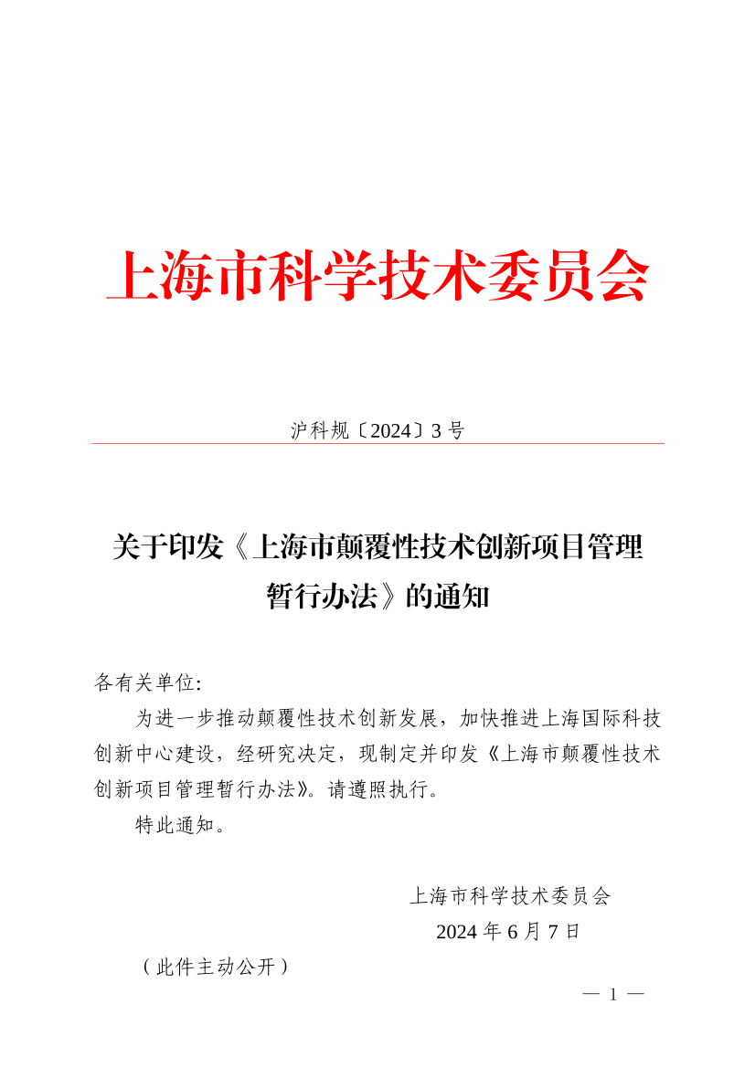 为进一步推动颠覆性技术创新发展,加快推进上海国际科技创新中心建设,经研究决定,现制定并印发《上海市颠覆性技术创新项目管理暂行办法》。请遵照执行。