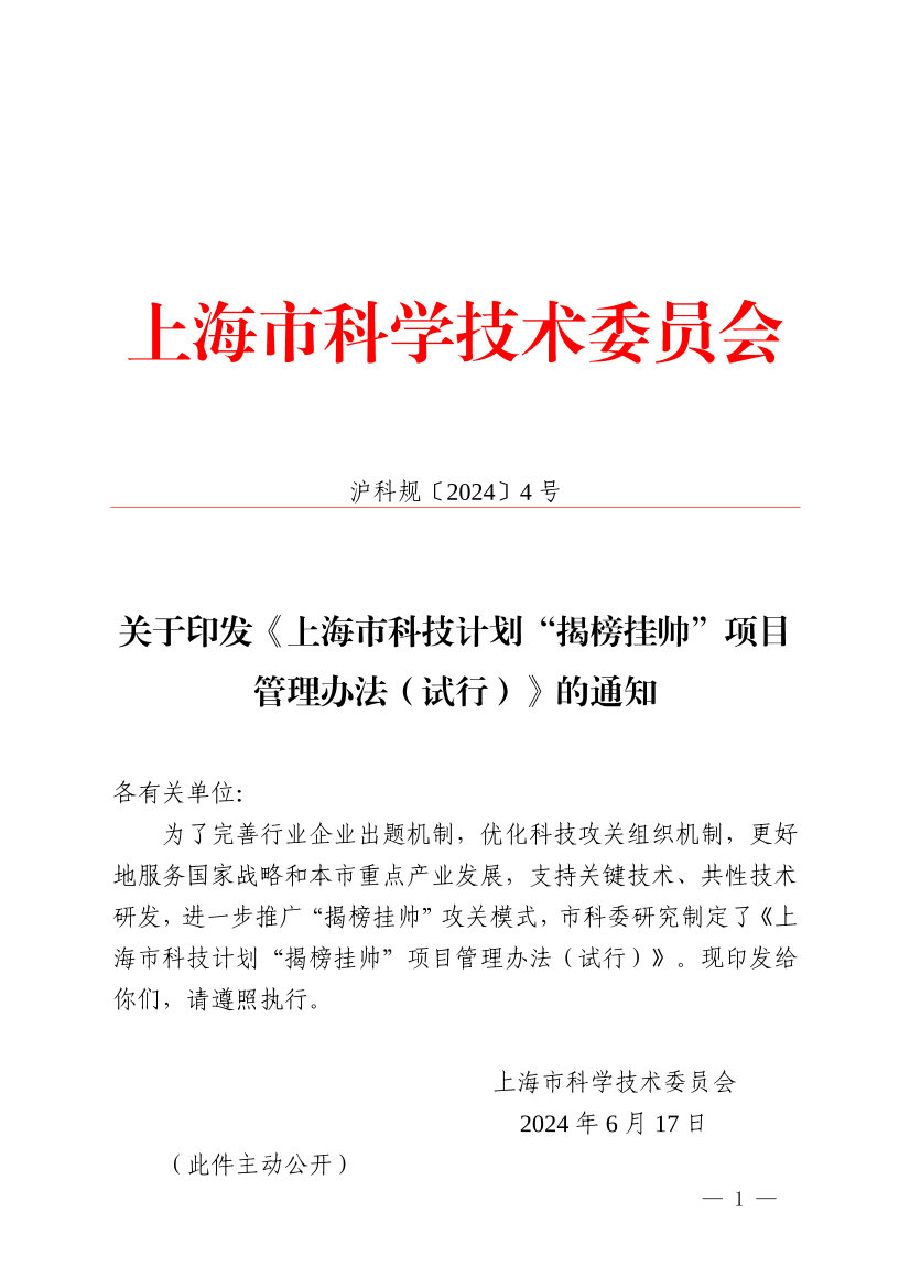 关于印发《上海市科技计划“揭榜挂帅”项目管理办法(试行)》的通知