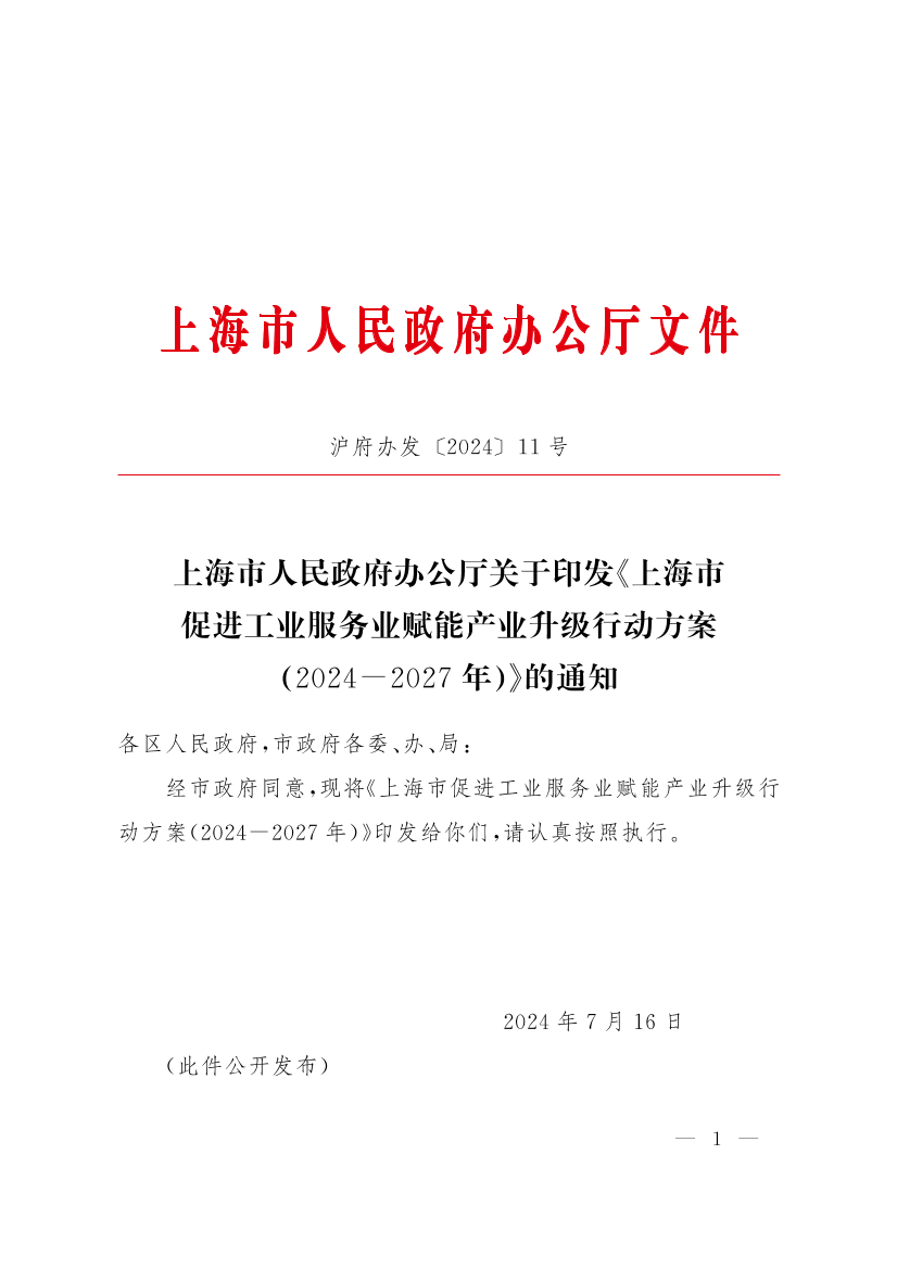 上海市人民政府办公厅关于印发《上海市促进工业服务业赋能产业升级行动方案(2024-2027年)》的通知
