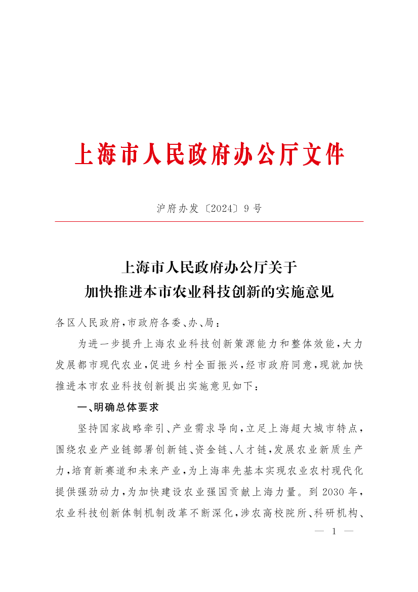 为进一步提升上海农业科技创新策源能力和整体效能,大力发展都市现代农业,促进乡村全面振兴,经市政府同意,现就加快推进本市农业科技创新提出实施意见如下: