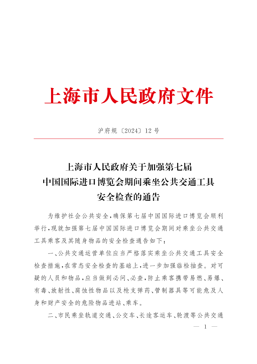 为维护社会公共安全,确保第七届中国国际进口博览会顺利举行,现就加强第七届中国国际进口博览会期间对乘坐公共交通工具乘客及其随身物品的安全检查通告如下: