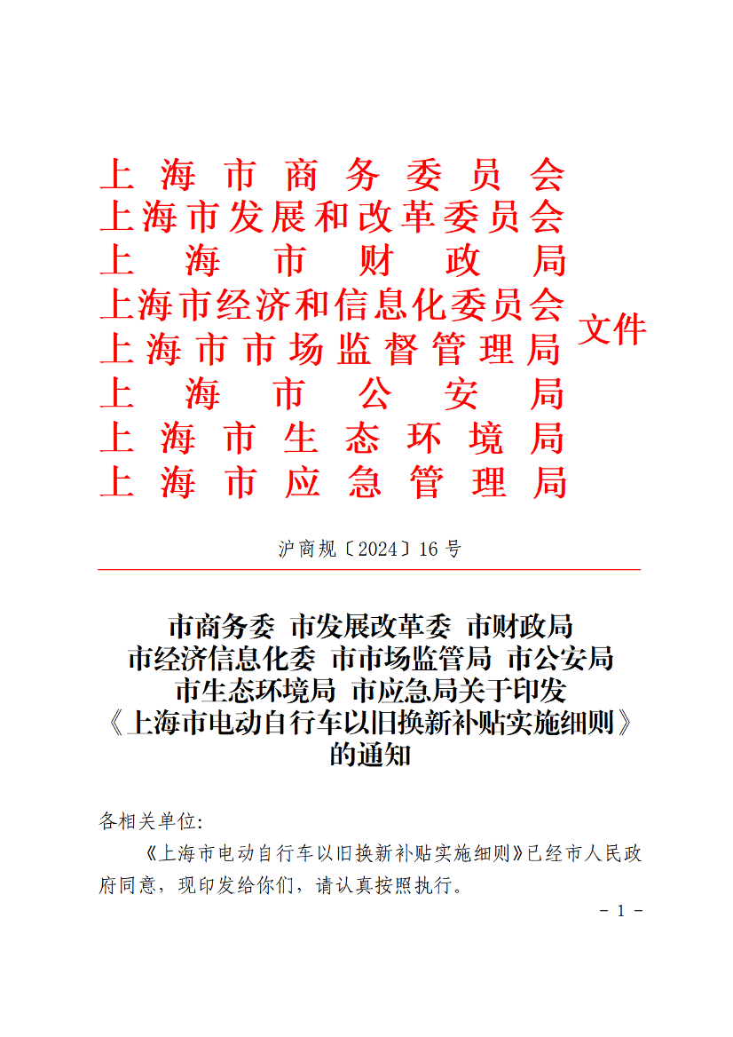 为贯彻落实商务部等14部门《推动消费品以旧换新行动方案》(商消费发〔2024〕58号)、商务部等5部门办公厅(室)《推动电动自行车以旧换新实施方案》(商办流通函〔2024〕396号)、《上海市电动自行车安全隐患全链条整治行动实施方案》(沪府办〔2024〕34号)等工作要求,有序推动本市电动自行车以旧换新,结合本市实际,制定本实施细则。