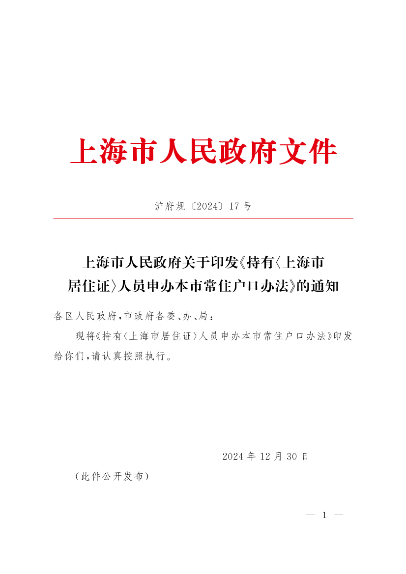 上海市人民政府关于印发《持有〈上海市居住证〉人员申办本市常住户口办法》的通知