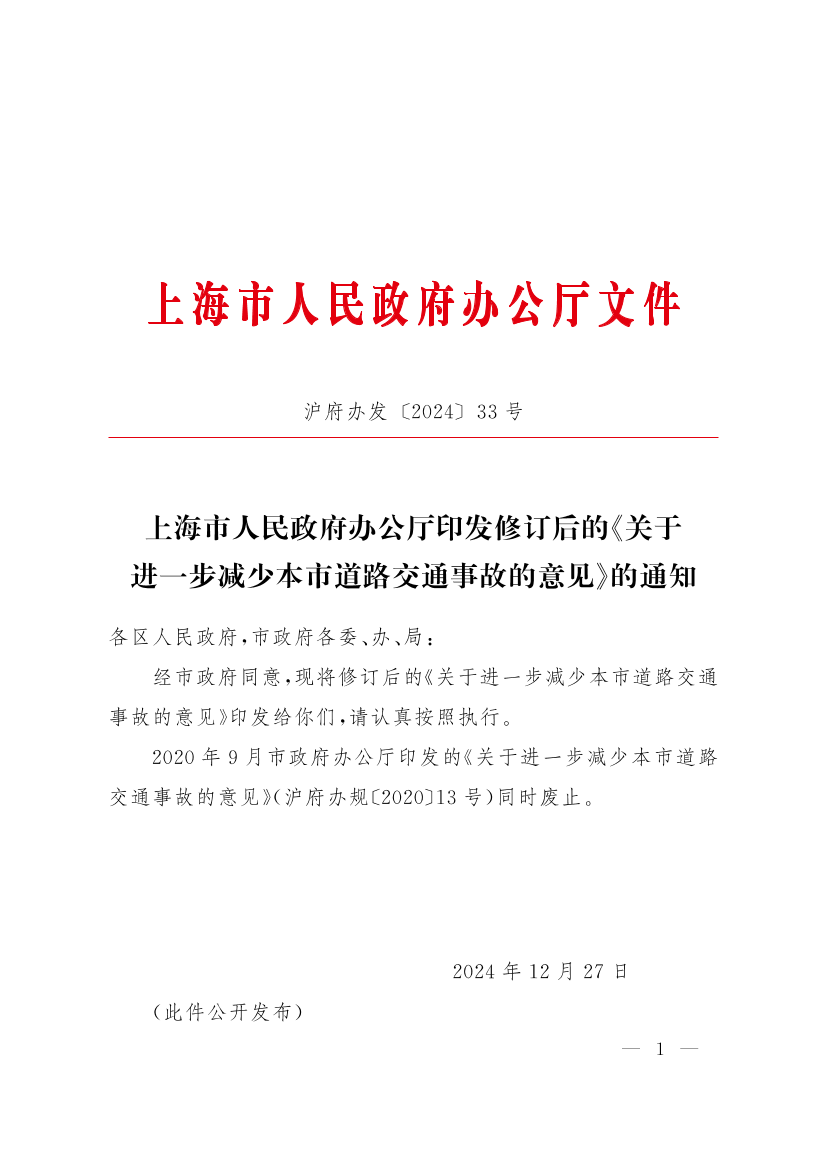 2020年9月市政府办公厅印发的《关于进一步减少本市道路交通事故的意见》(沪府办规〔2020〕13号)同时废止。