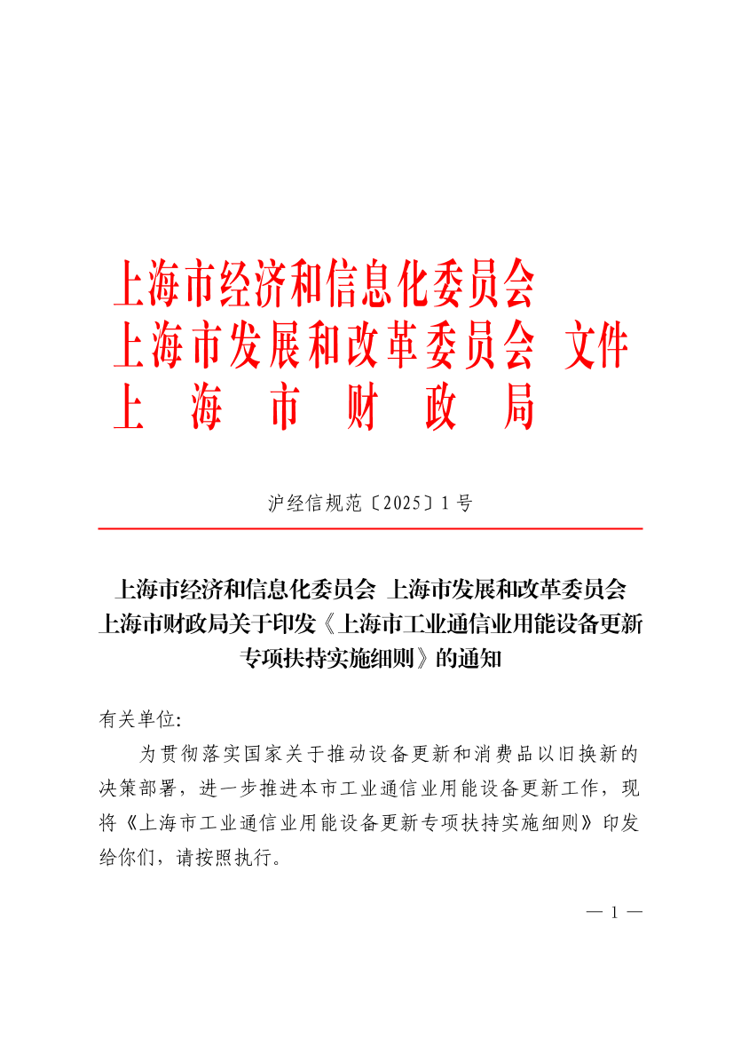 为贯彻落实国家关于推动设备更新和消费品以旧换新的决策部署,进一步推进本市工业通信业用能设备更新工作,现将《上海市工业通信业用能设备更新专项扶持实施细则》印发给你们,请按照执行。
