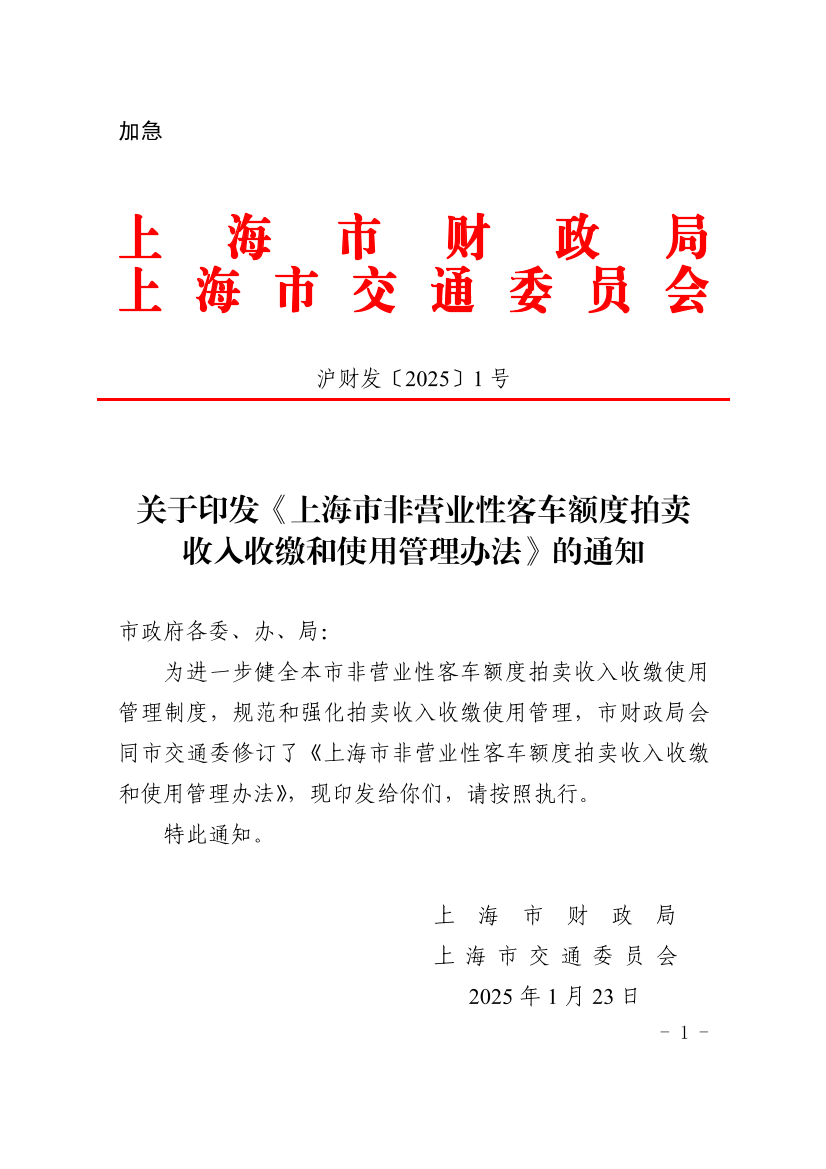 2020年3月6日上海市财政局和上海市交通委联合印发的《关于印发〈上海市非营业性客车额度拍卖收入收缴和使用管理办法〉的通知》(沪财发〔2020〕4号)同时废止。