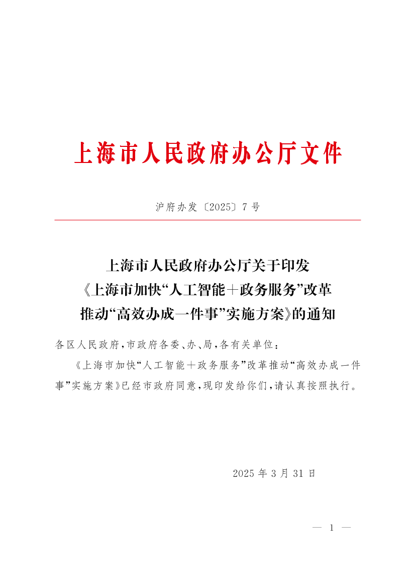 上海市人民政府办公厅关于印发《上海市加快“人工智能+政务服务”改革 推动“高效办成一件事”实施方案》的通知