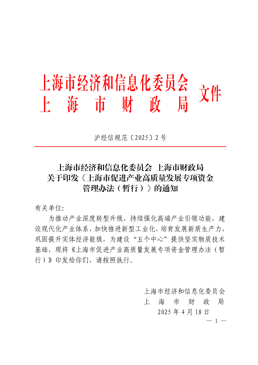 上海市经济和信息化委员会 上海市财政局关于印发《上海市促进产业高质量发展专项资金 管理办法(暂行)》的通知